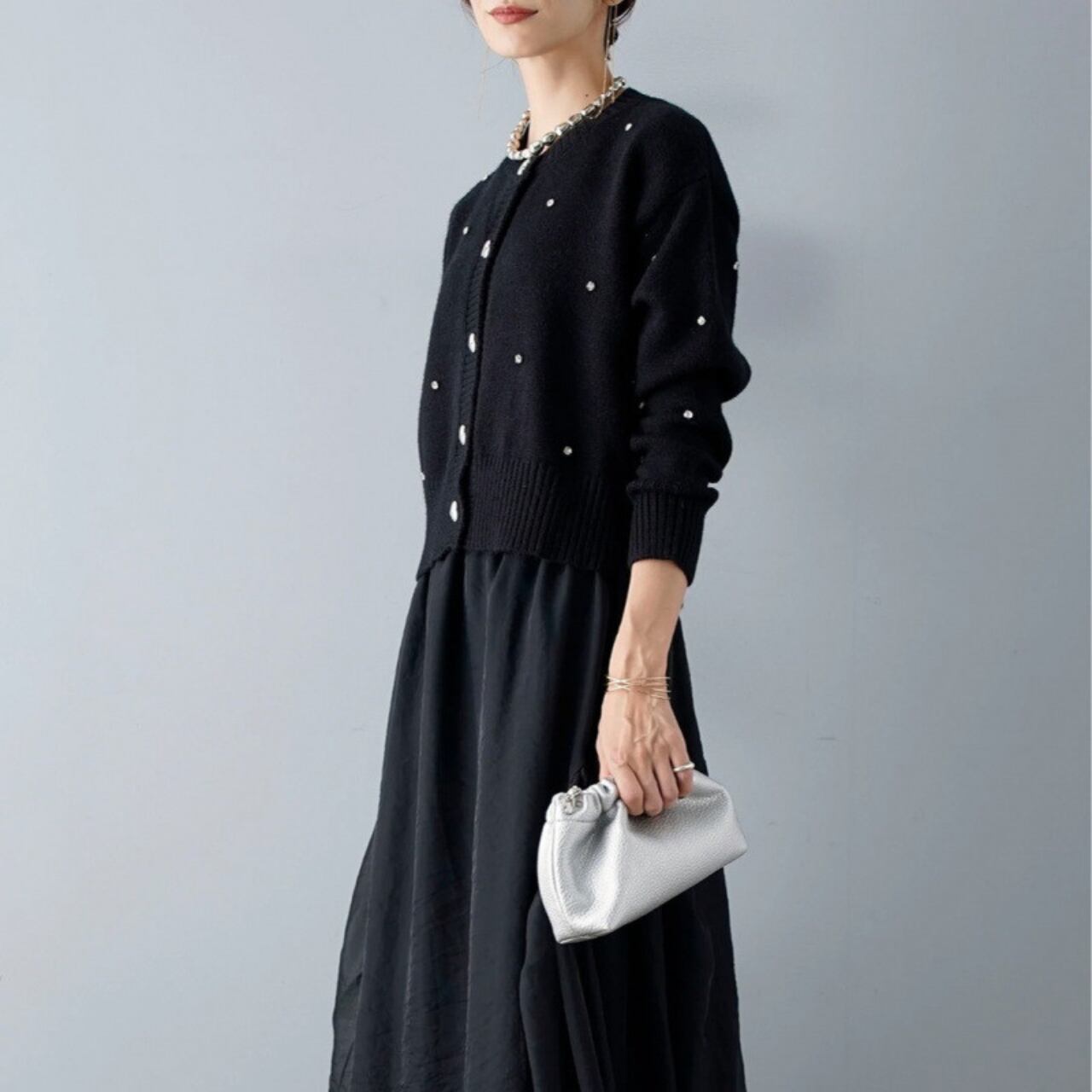 # ハートボタン ビジュー カーディガン ブラック
