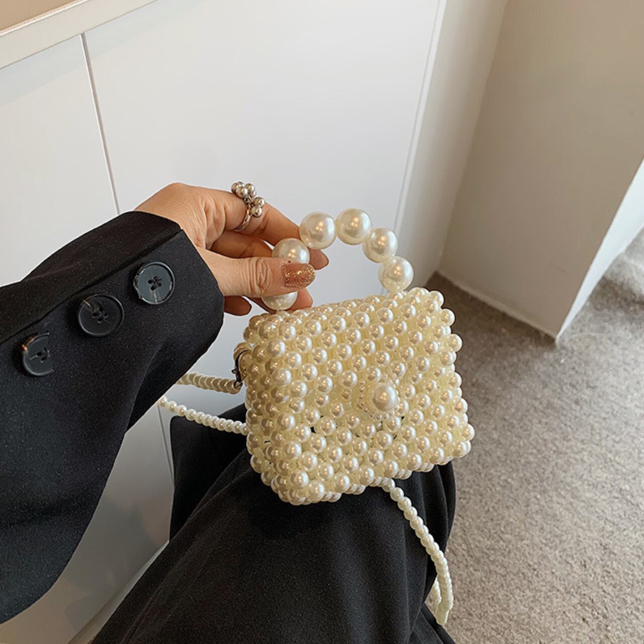 まるでジュエリーのような輝きを放つ、パールを贅沢に編み込んだミニバッグ。手のひらサイズながら、リップやミニ財布がしっかり収まる実用性も。華奢なストラップ付きで、クロスボディでも肩がけでもOK。ドレスアップスタイルにはもちろん、デニムに合わせて抜け感を出してもおしゃれ。「ただのバッグじゃない」特別感を、いつものコーデにプラスして。デイリーユースから特別なイベントまで、様々なシーンで活躍し、お洒落を引き立てます。女性らしさを演出しつつ、カジュアルにもフォーマルにも合わせやすい一品として、ぜひワードローブに加えてお楽しみください!