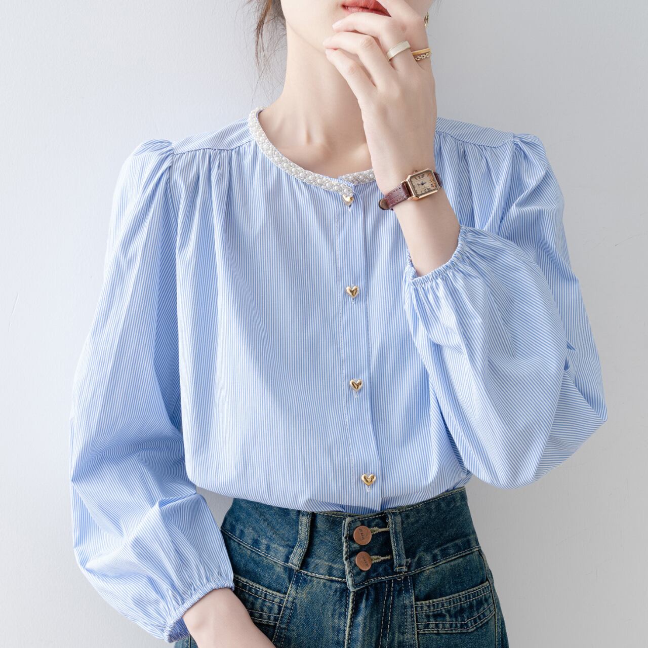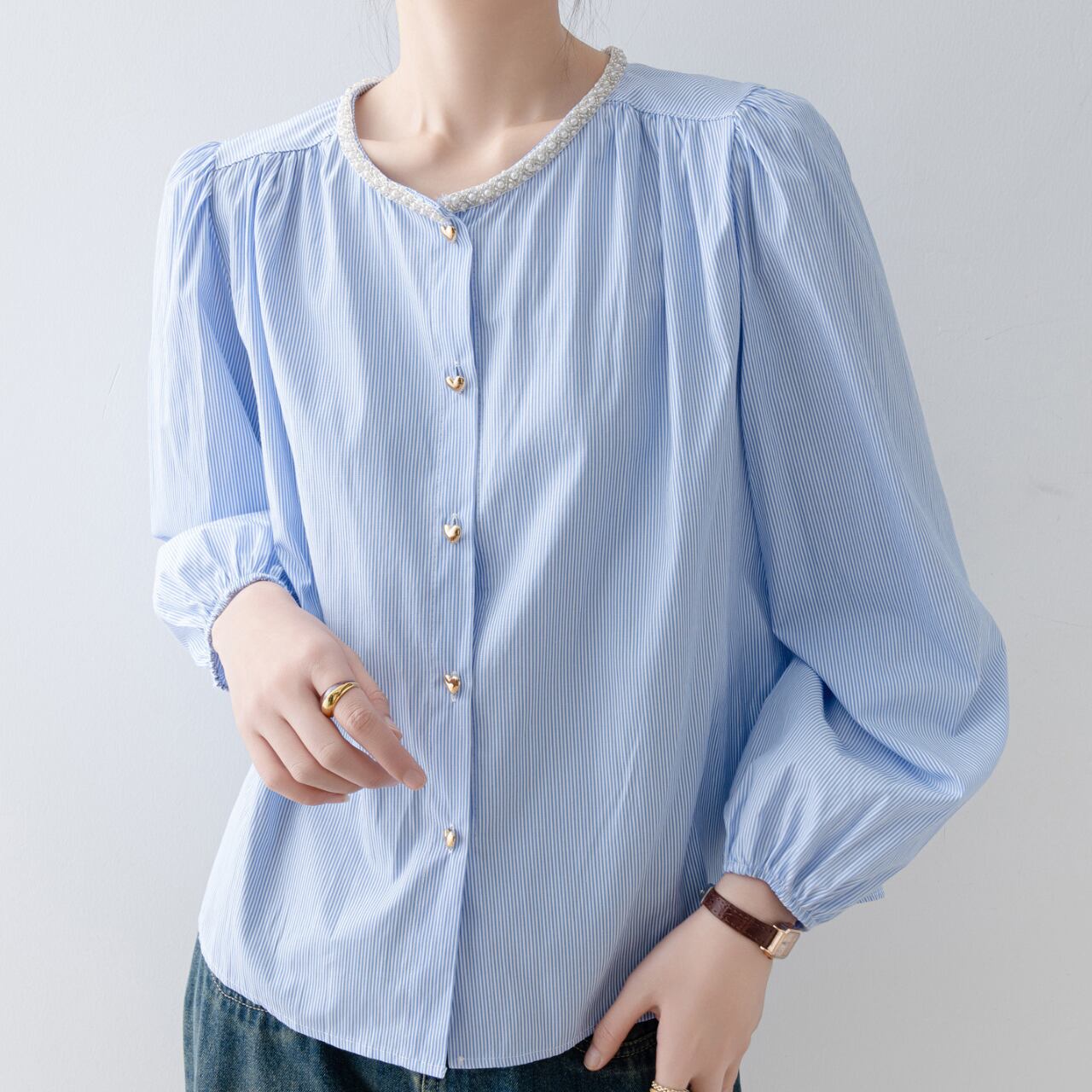 ハートボタン パール ライトブルー ラウンドネック ストライプ ランタンスリーブ ブラウス 250333