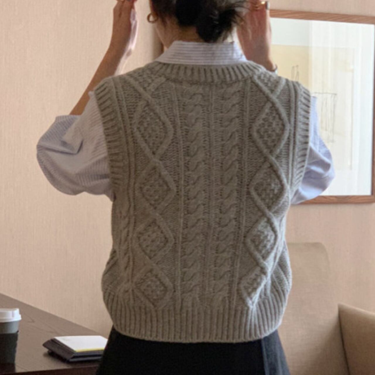 韓国風 ウール混 ツイストパターン ニット ベスト グレー 250350