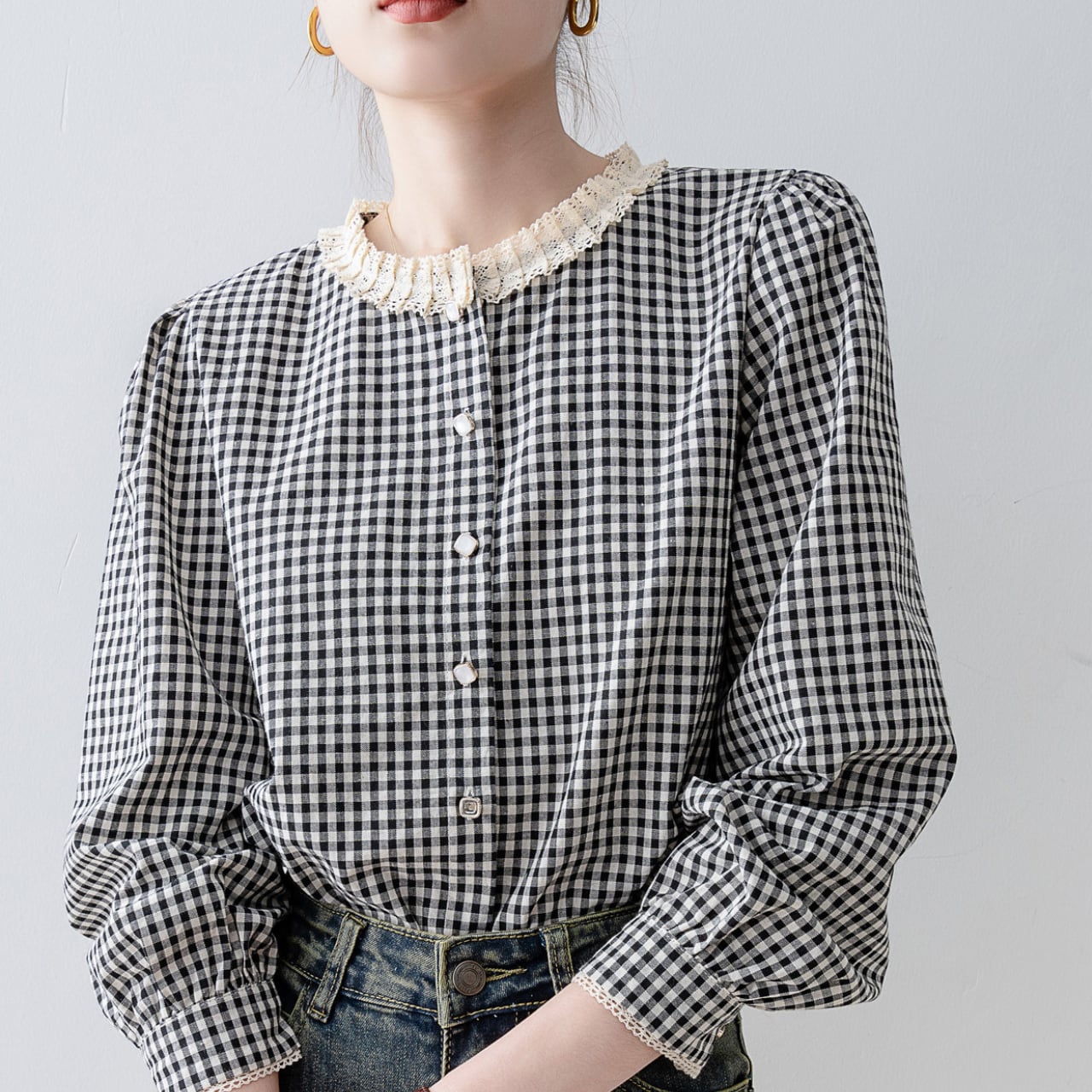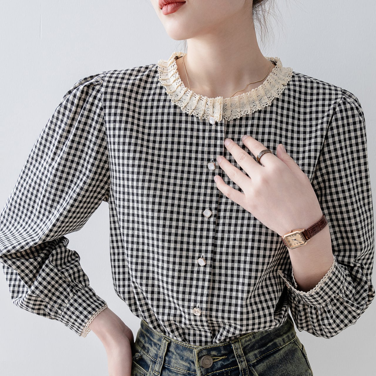 レース襟が可憐で華やかなギンガムチェックブラウスで、いつもの日常を特別に。