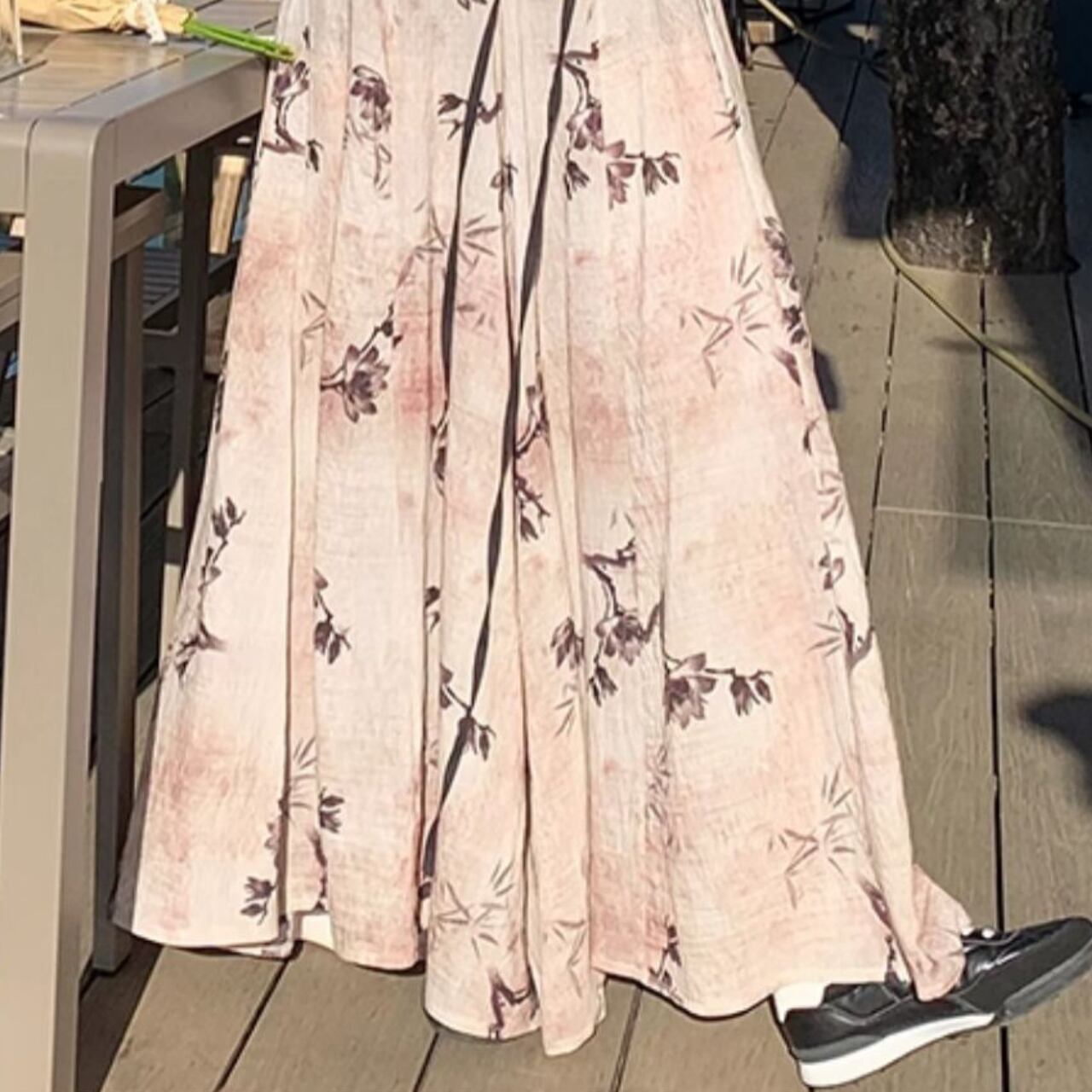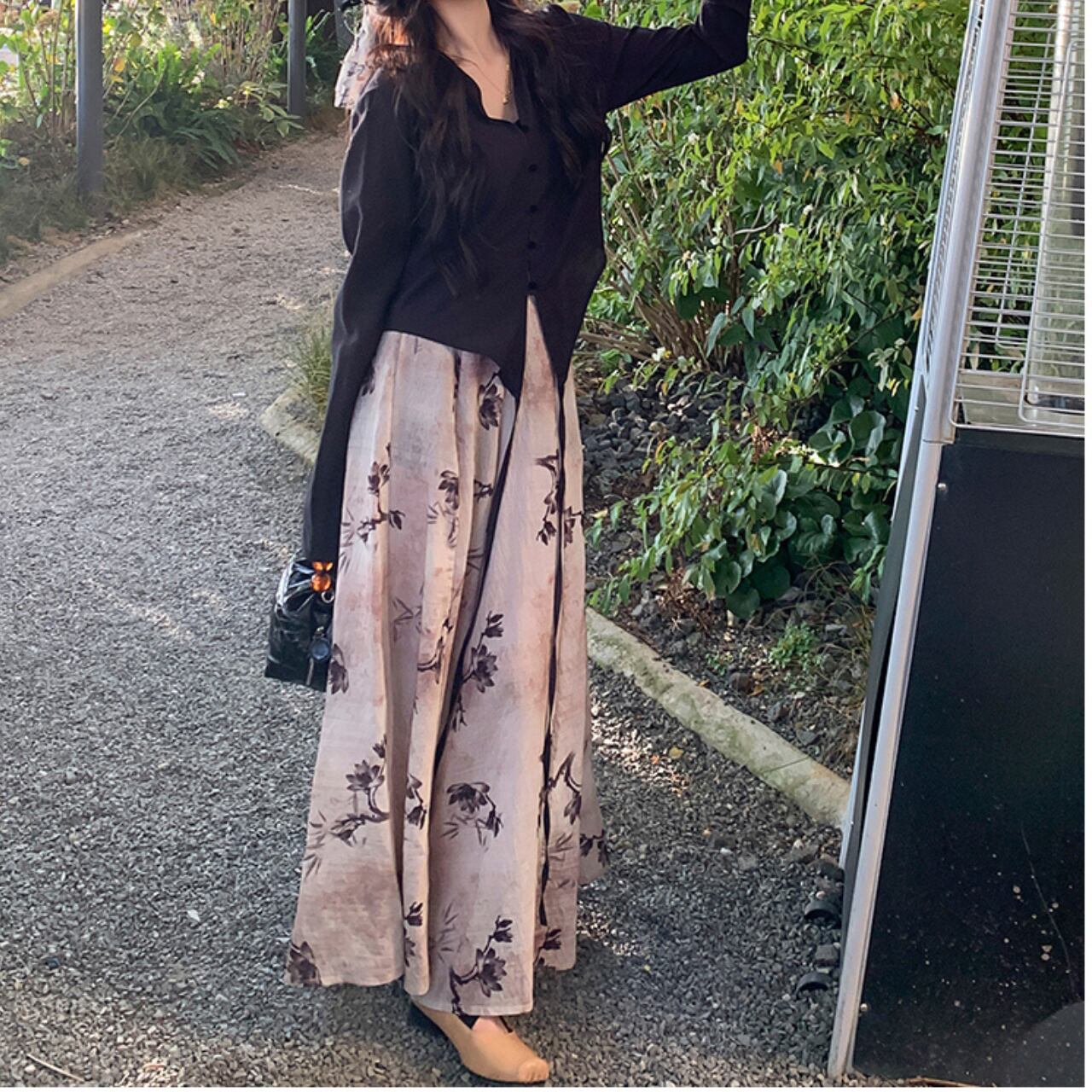 # ツーピース フローラルデザイン スカートパンツ ブラックトップス セット