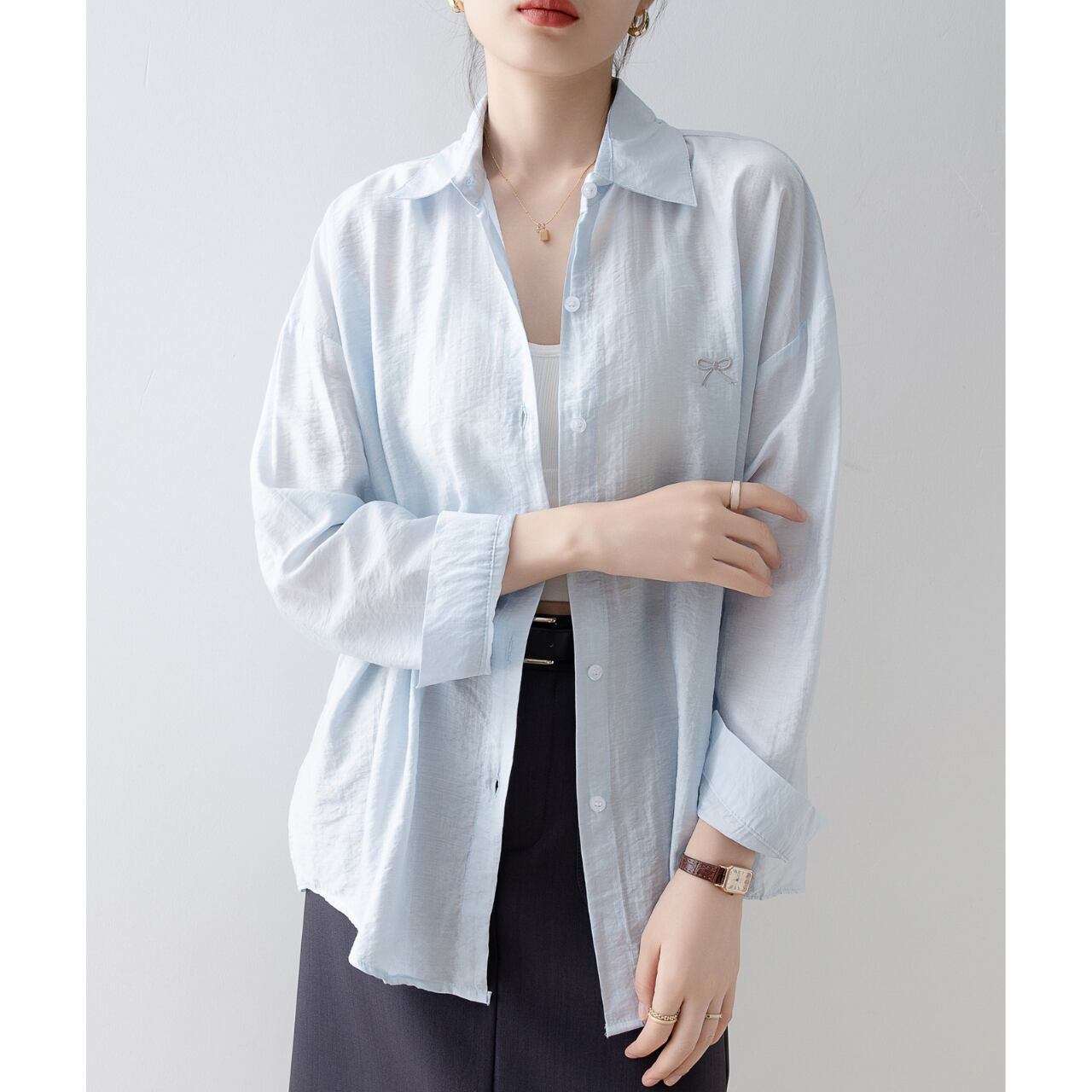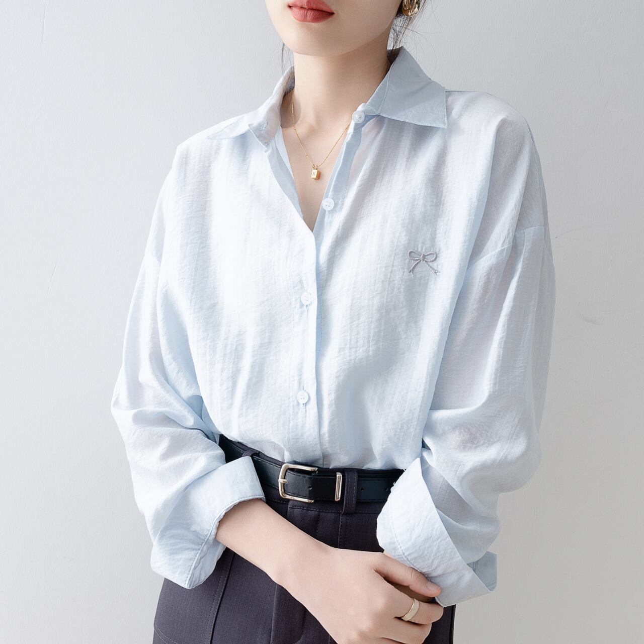 リボンのワンポイント刺繡が施されたこのシアーシャツブラウスは、柔らかい印象を与えるアイテムです!