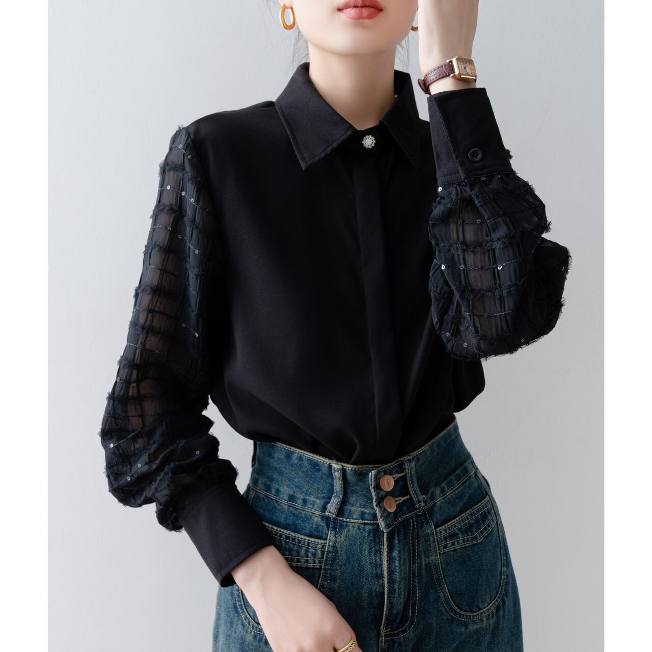 # フラワーボタン シフォン袖 シャツ ブラウス ブラック