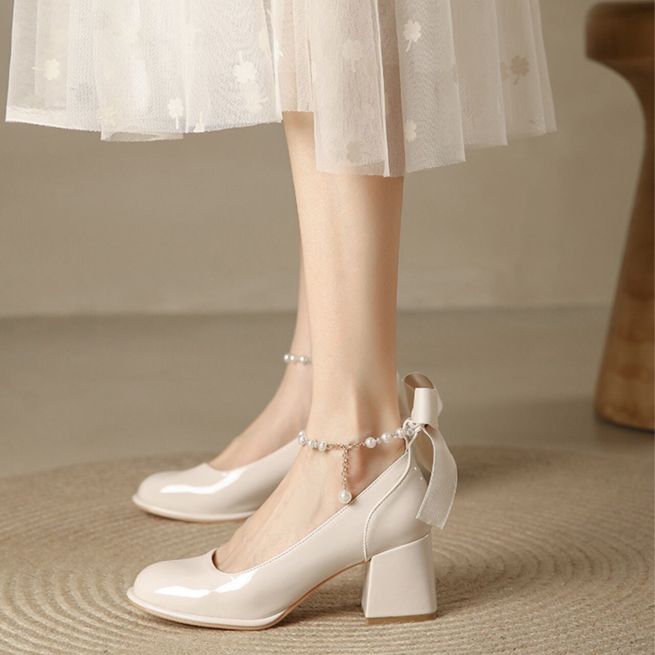 # エナメル リボン パールチェーン ブロックヒール パンプス ライトベージュ