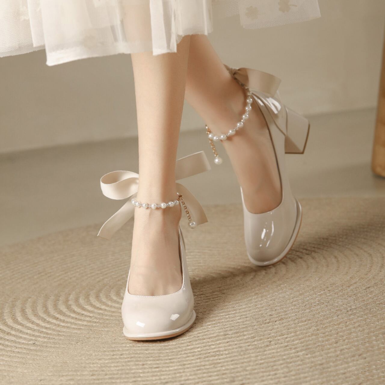 エナメル リボン パールチェーン ブロックヒール パンプス ライトベージュ 250369