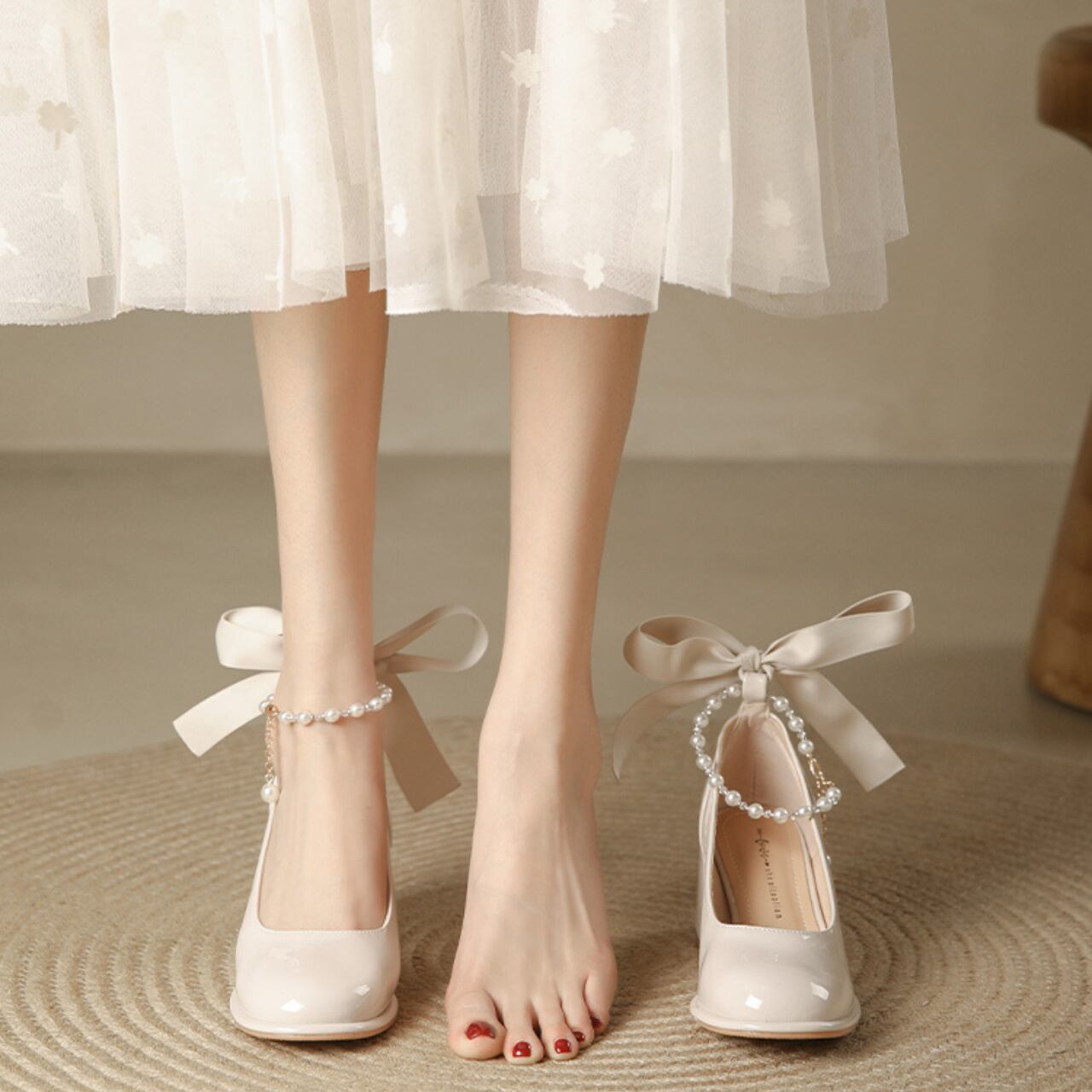 エナメル素材とリボンデザインが可愛らしさを演出するこのパンプスは、魅力溢れる一足です!ライトベージュの優しい色合いは、どんなスタイルにも合わせやすく、オフィスやデート、カジュアルなお出かけにも最適。パールチェーンが足元に華やかさを加え、ブロックヒールは安定感があり、長時間の着用でも快適さを実感できます。トレンドの“韓国ガーリー”や“スクールガール風”コーデにも好相性。ミニスカートやプリーツスカート、白ソックスと合わせて、今っぽく着こなせます。全体のトーンを揃えると統一感が出て、写真映えも抜群!フレンチシックやボヘミアンスタイルとも相性抜群で、さまざまなコーディネートを楽しむことができるアイテムです。
