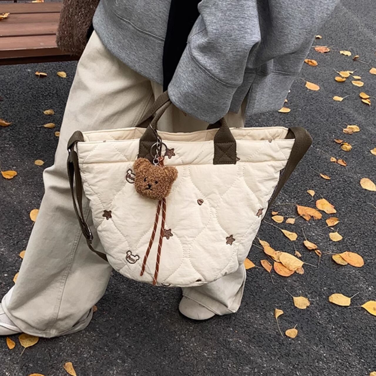 # くまチャーム付き 刺繡 大容量 キルティング トートバッグ ショルダーバッグ