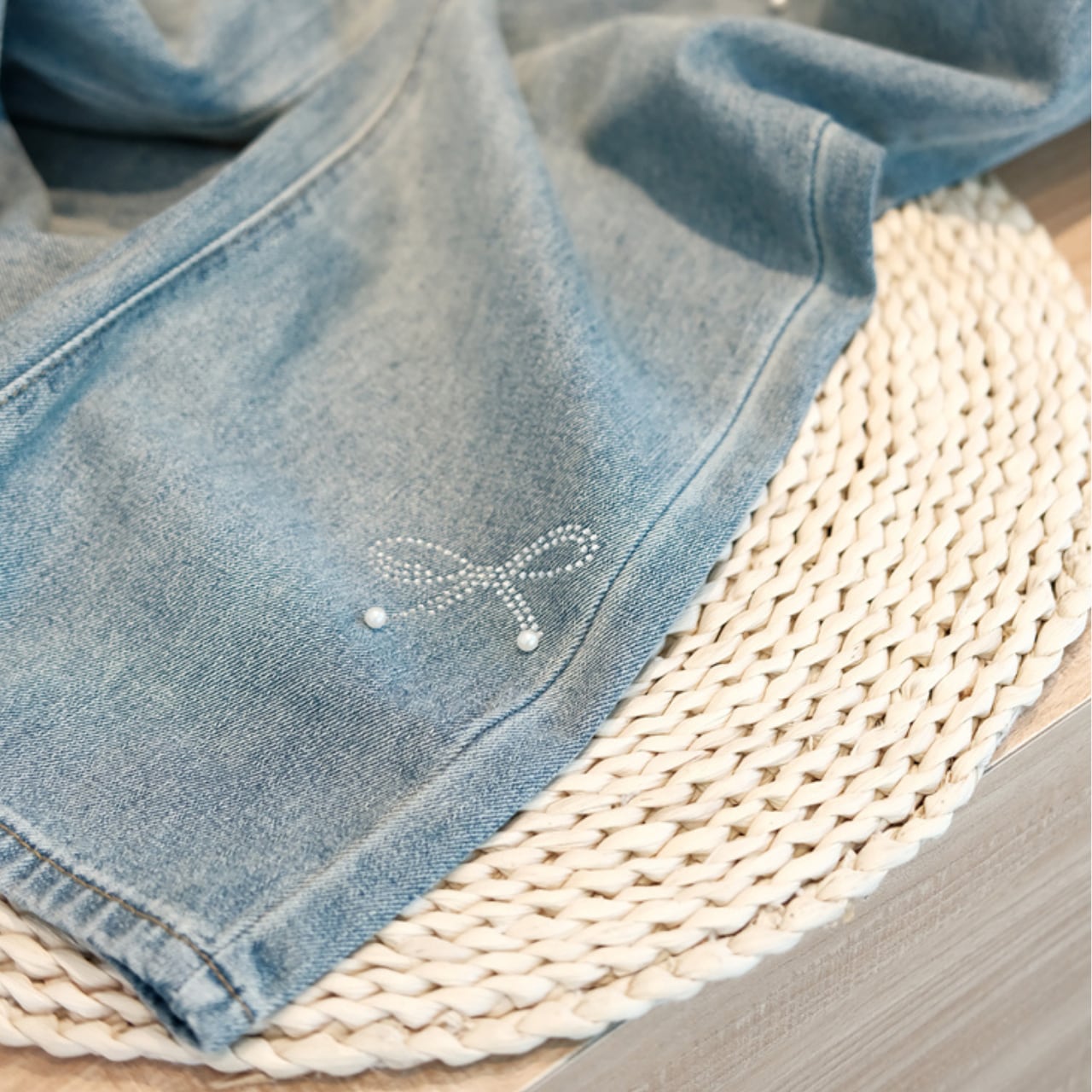 リボン パール ラインストーン ストレート デニム パンツ 250378