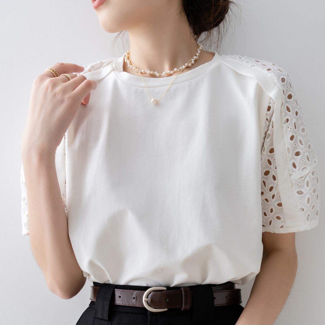 《白レース袖が上品》半袖フェミニンカットソー|通勤・夏のオフィスコーデに