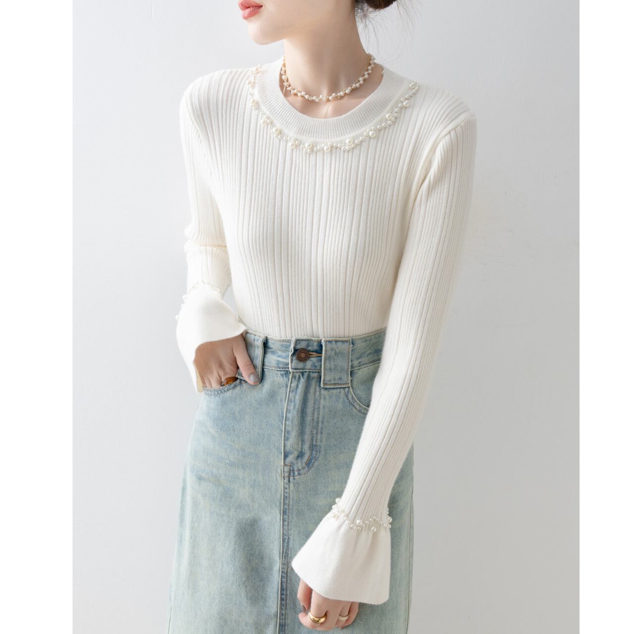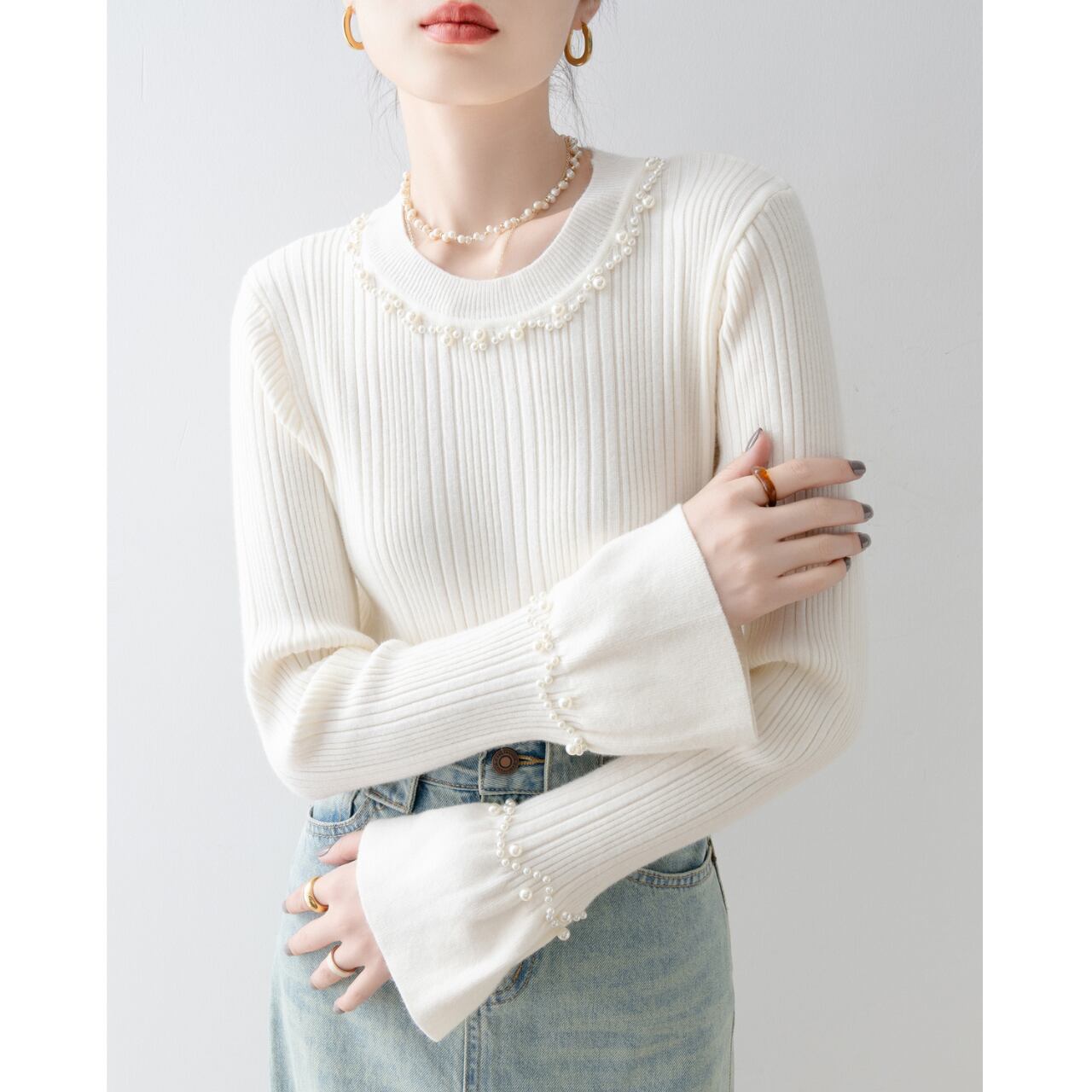 袖口にかけて緩やかに広がるフレアスリーブが優雅な動きを生み出し、リブ編みの程よいフィット感が女性らしいシルエットを引き立てるリブニット。袖口にあしらわれたパールボタンが、上品なきらめきを添え、シンプルな中にも華やぎを感じさせます。