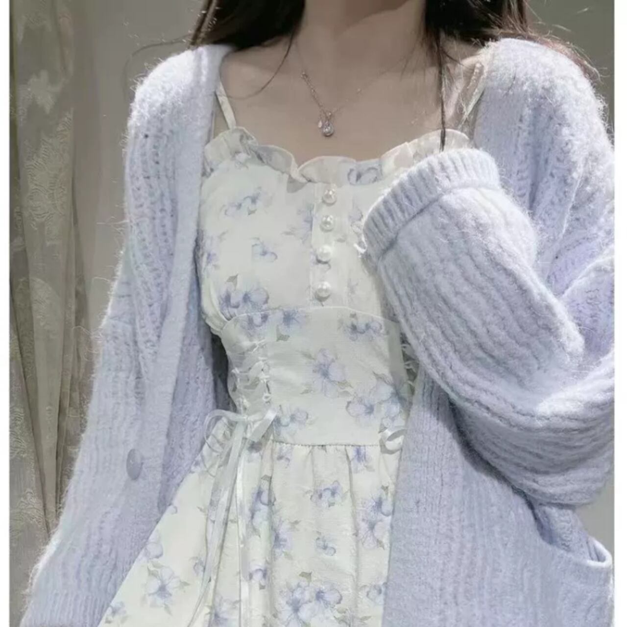 # フローラル ワンピース カーディガン 二点セット パステルブルー