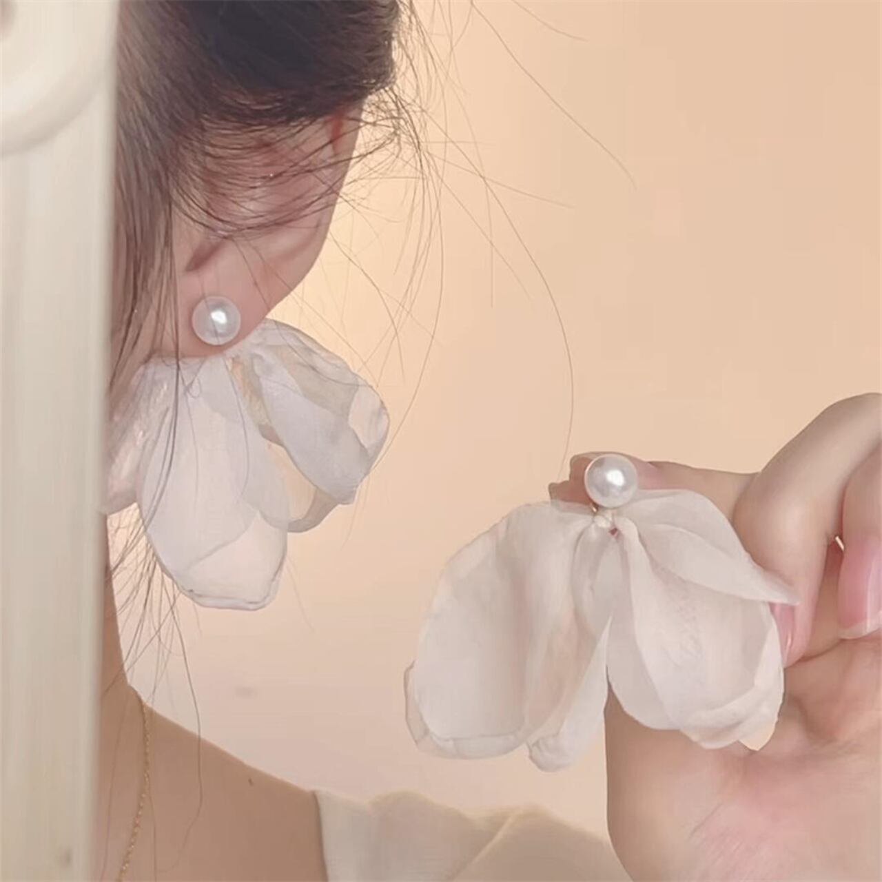 やさしく揺れる、花びらのようなときめきを耳元に。シフォンフラワー×パールの上品イヤリング。