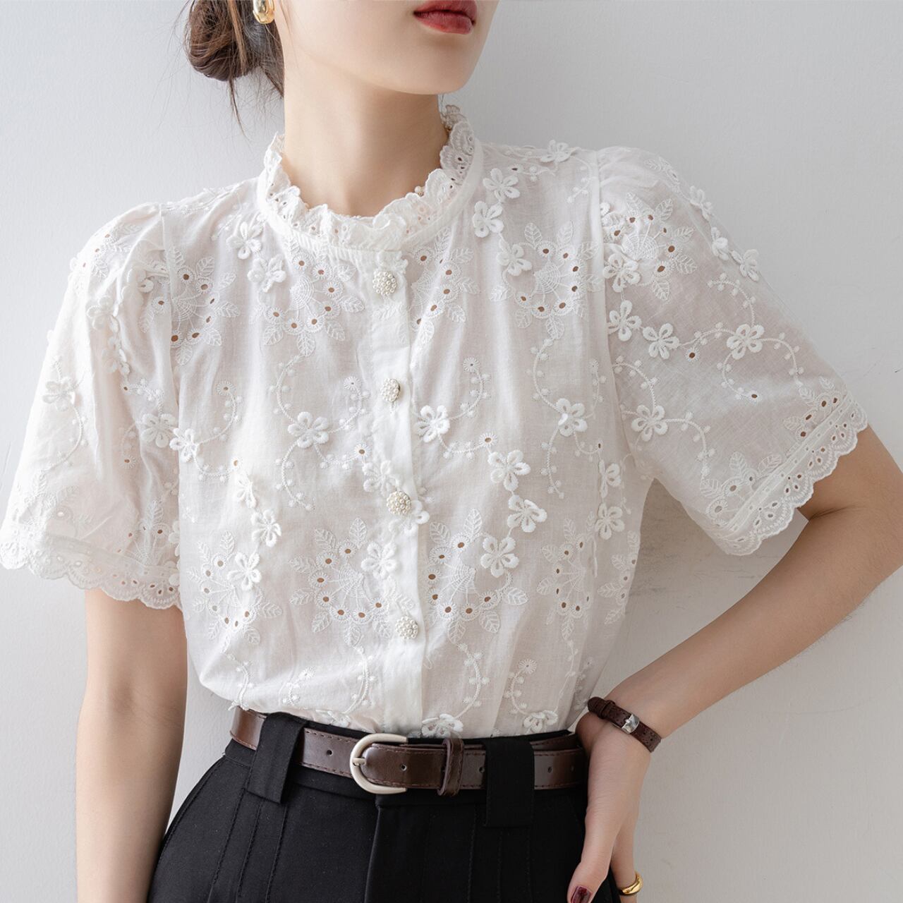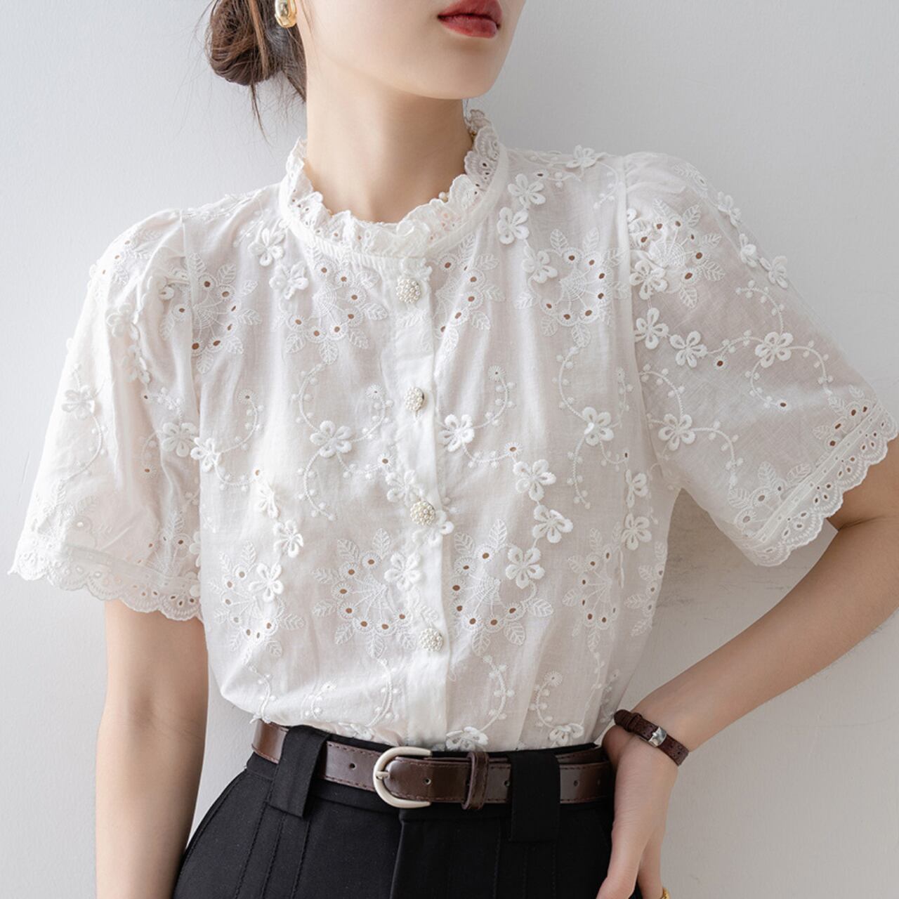 パールボタン フラワーレース ハイネック 半袖 ブラウス ホワイト 250445