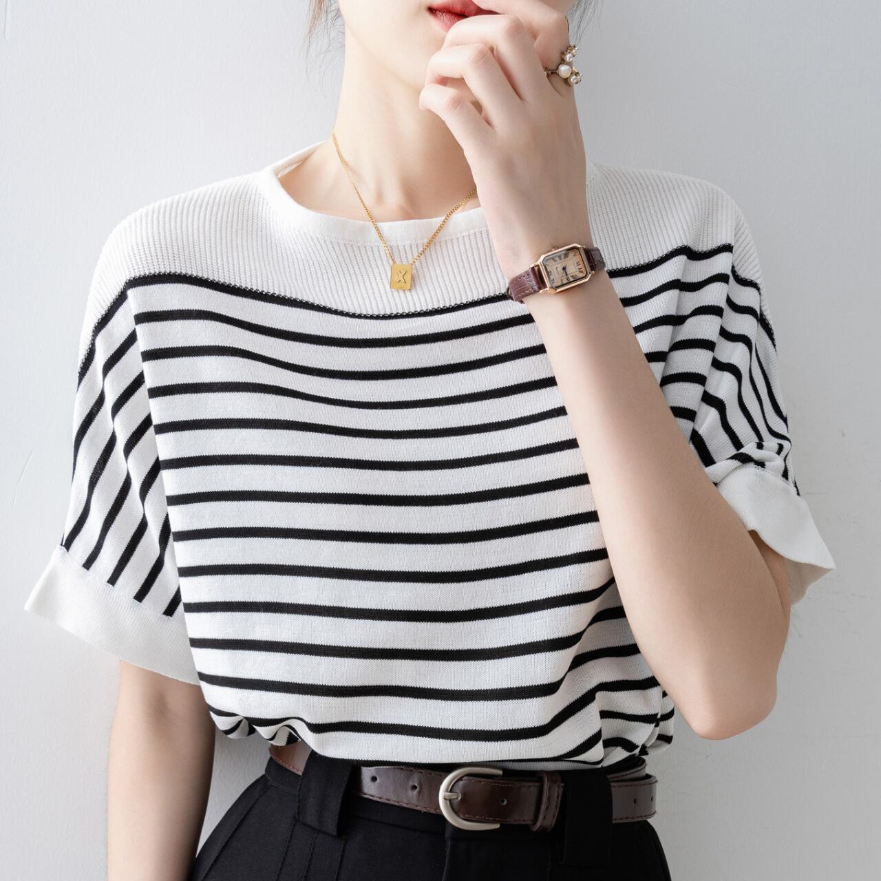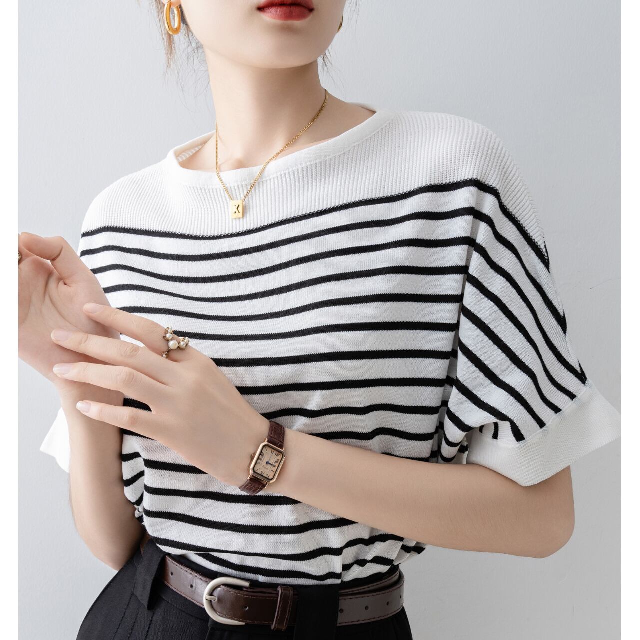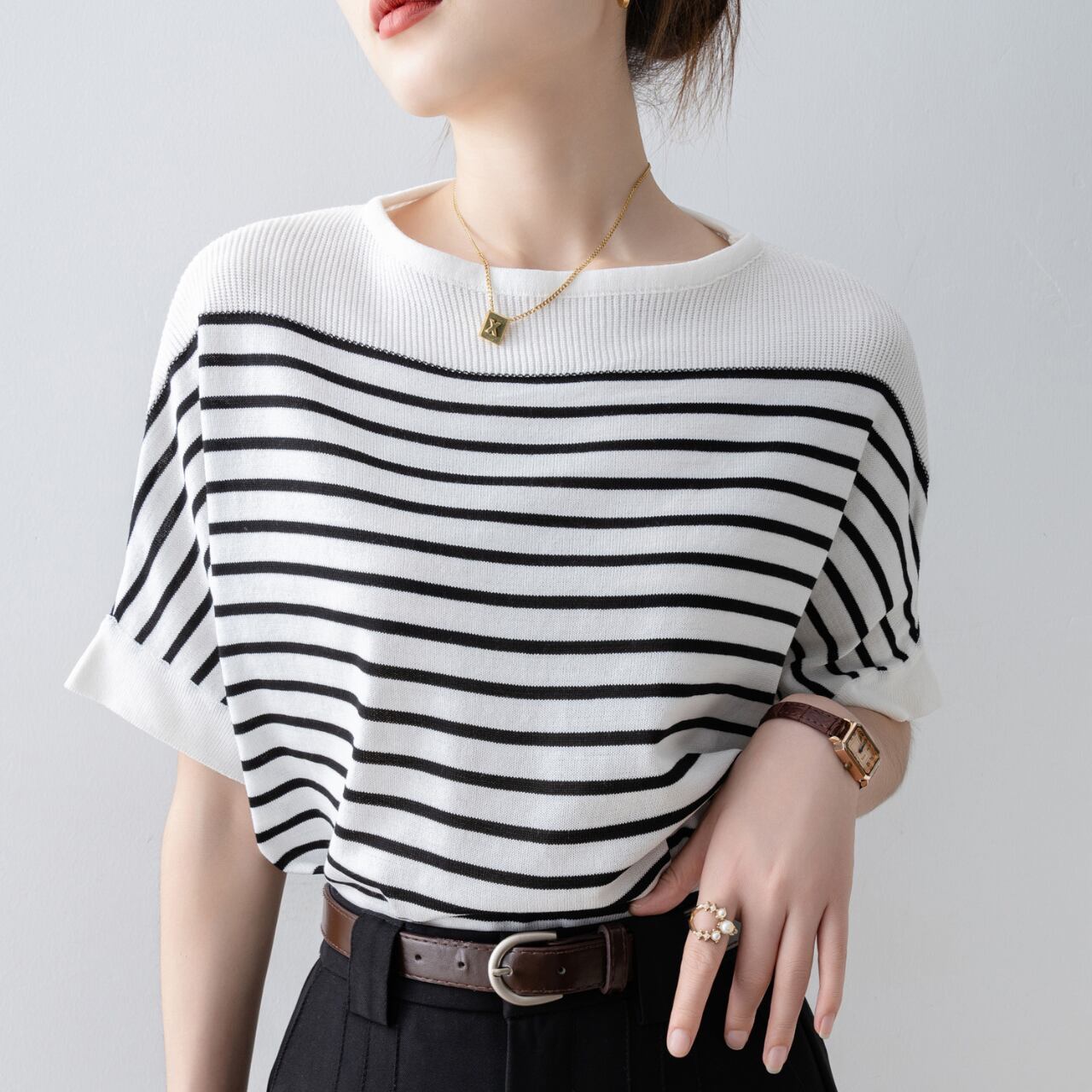 # ボーダー クルーネック 半袖 プルオーバー ブラック