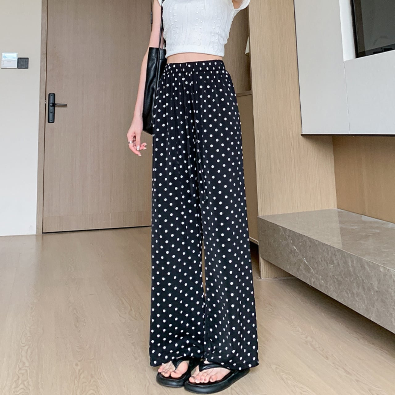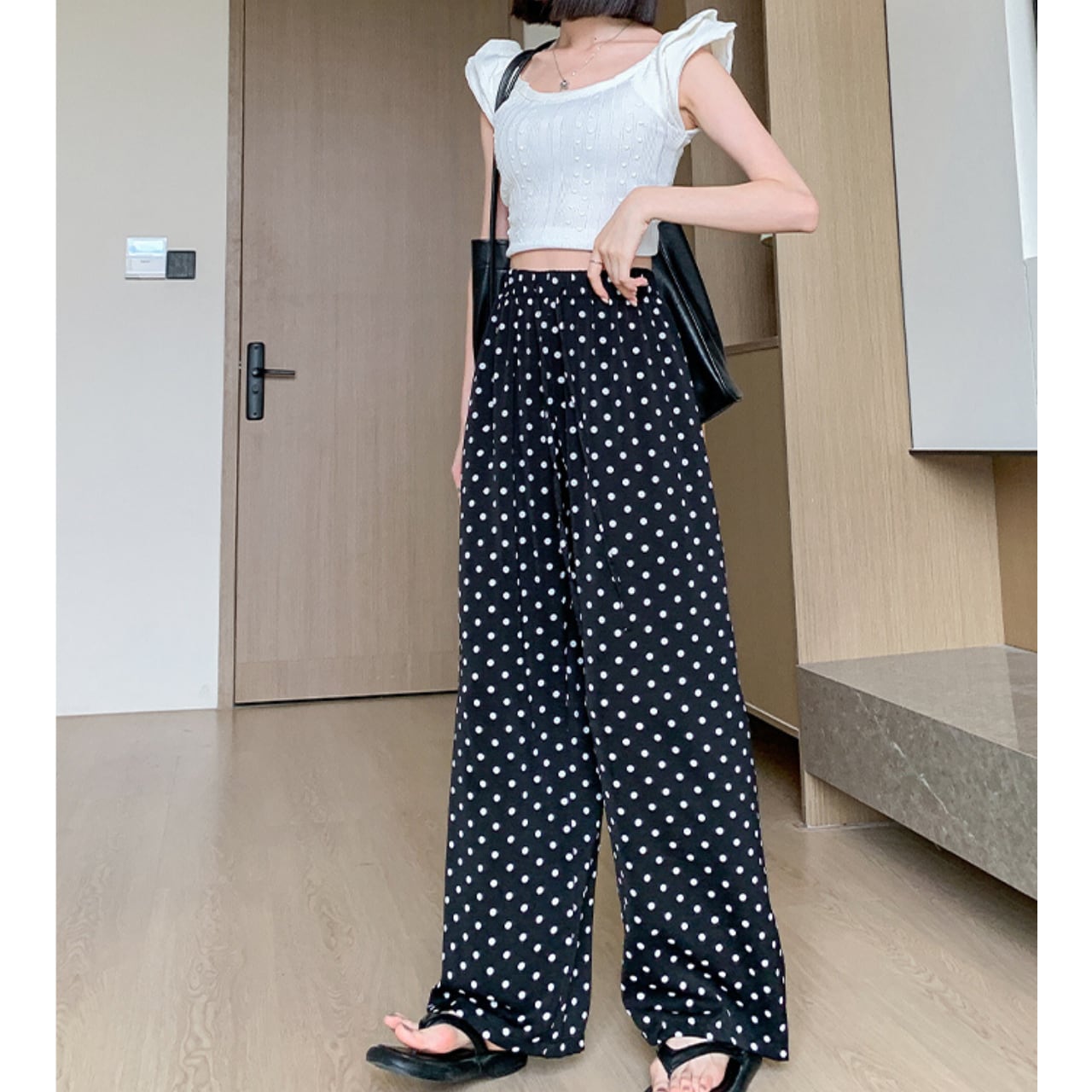 # ドット 冷感素材 シフォン ワイド レッグ パンツ ブラック