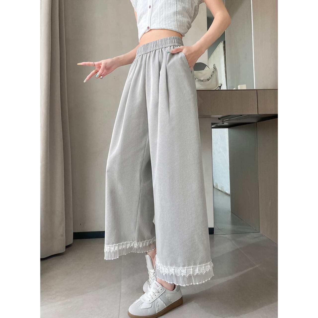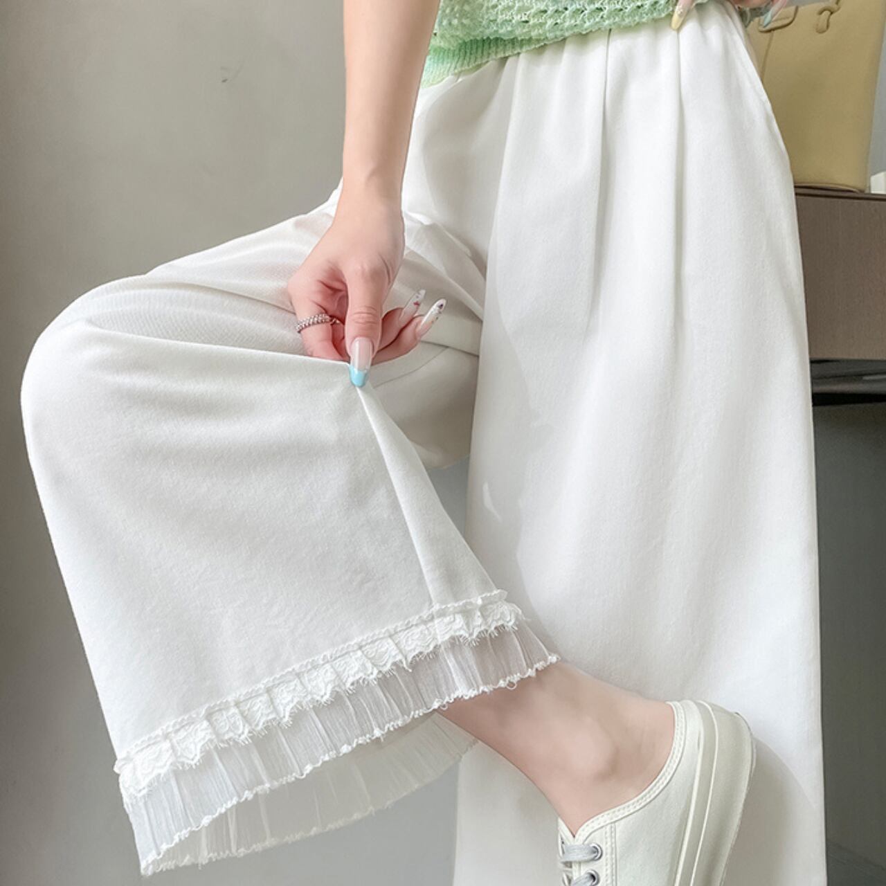 ナチュラルに可憐さをプラス。裾レース付きコットンワイドパンツ。