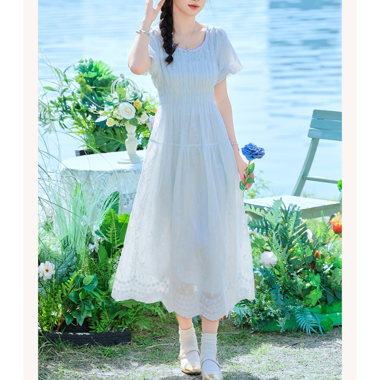 やわらかな陽射しに映える、繊細レースのロングワンピース。