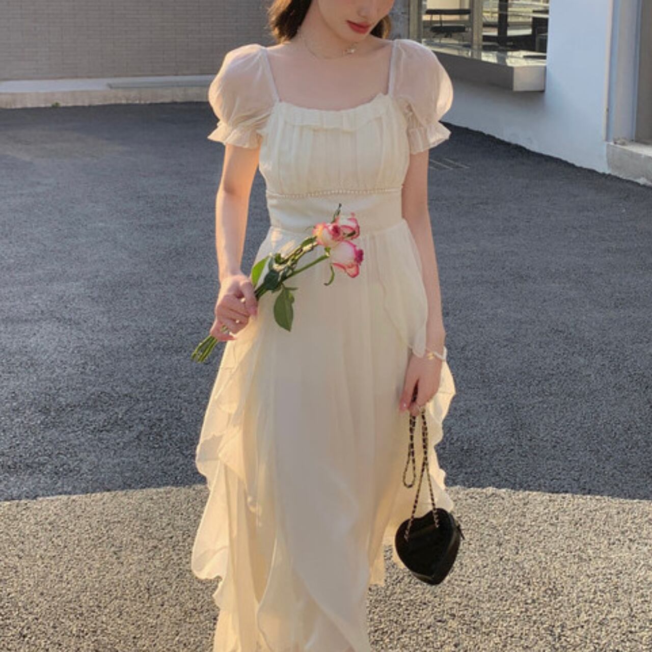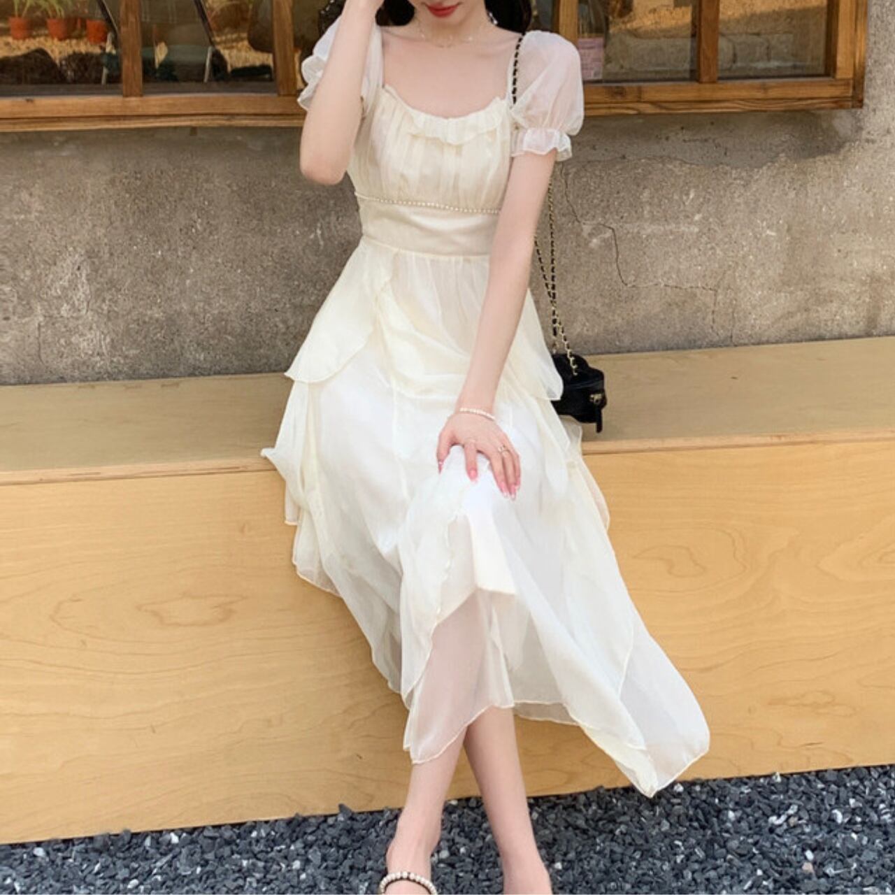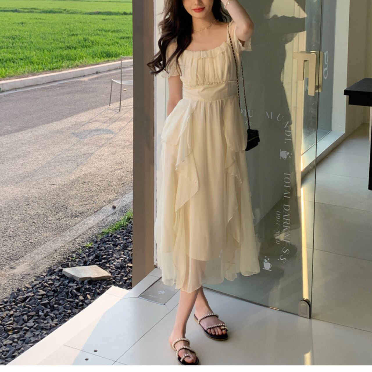 ふんわりと重なるティアードシフォンが、歩くたびにやさしく揺れる。