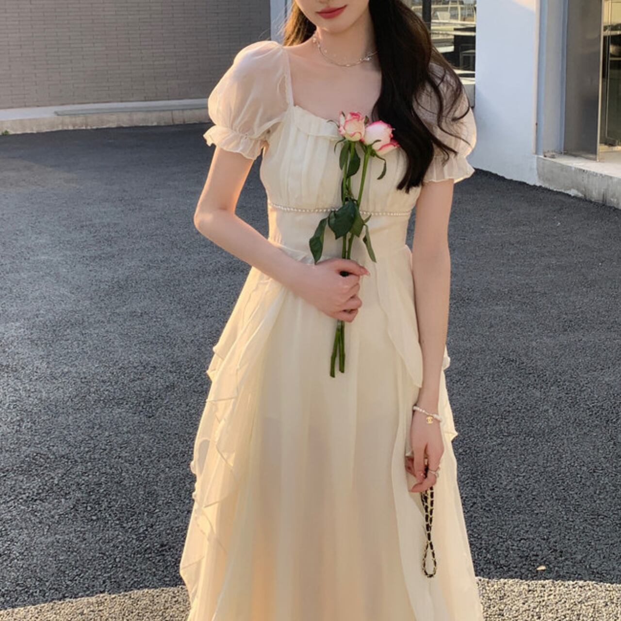スクエアネックとパフスリーブがデコルテを美しく魅せ、