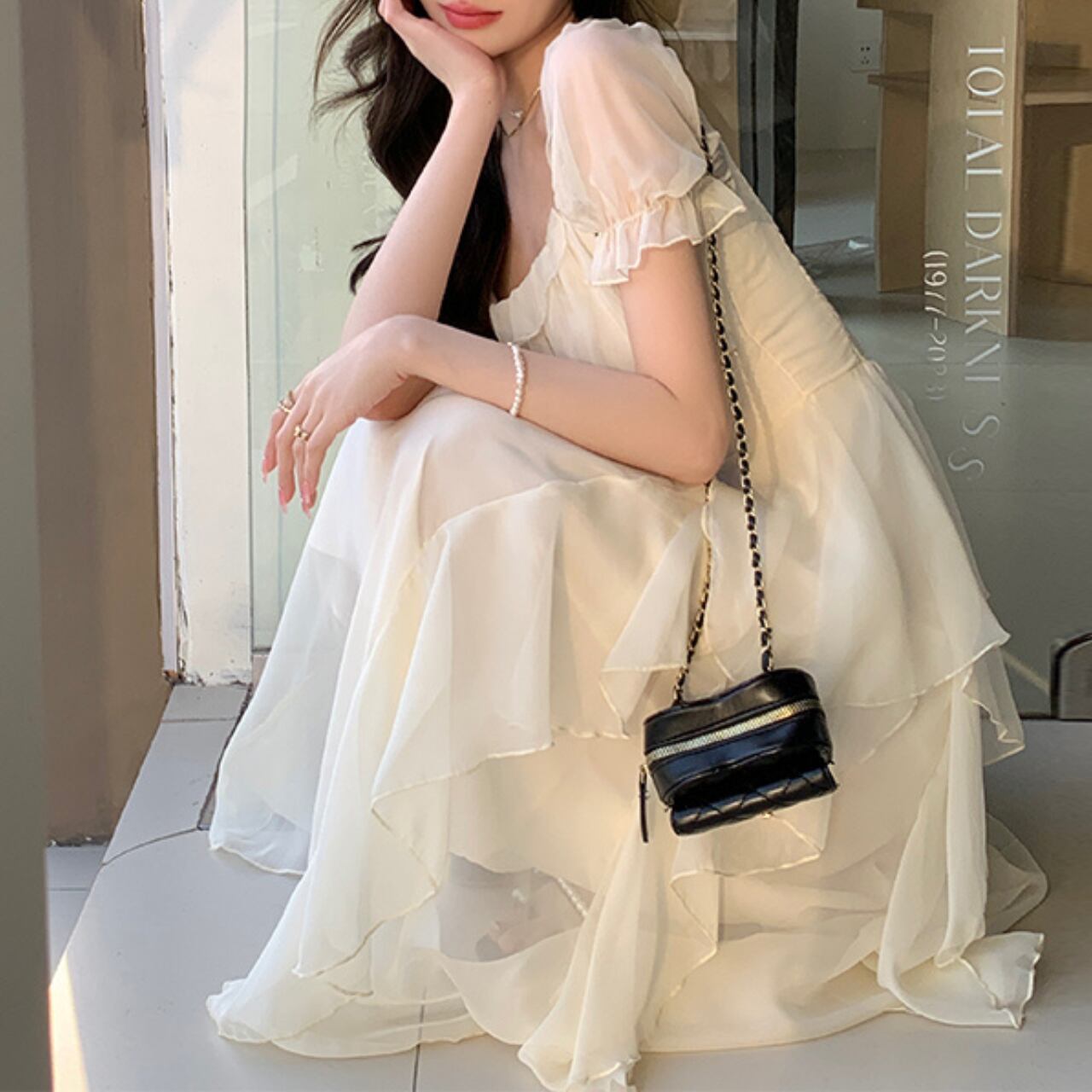 ふんわりと重なるティアードシフォンが、歩くたびにやさしく揺れる。