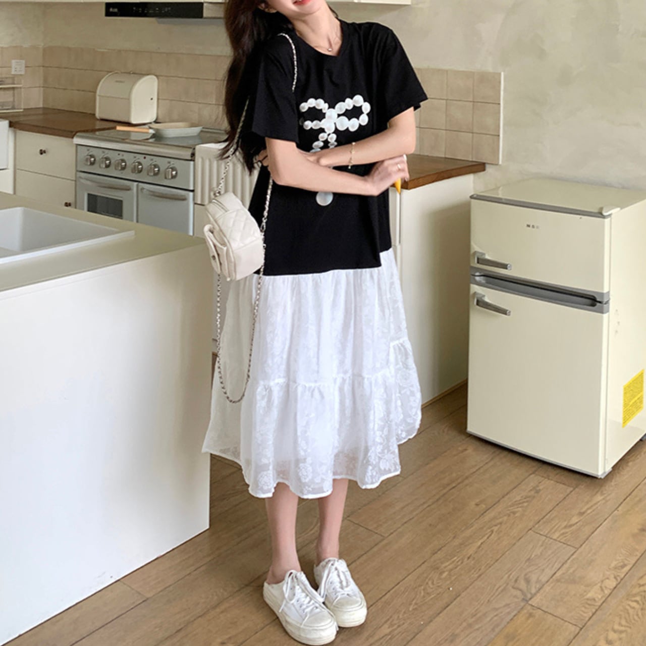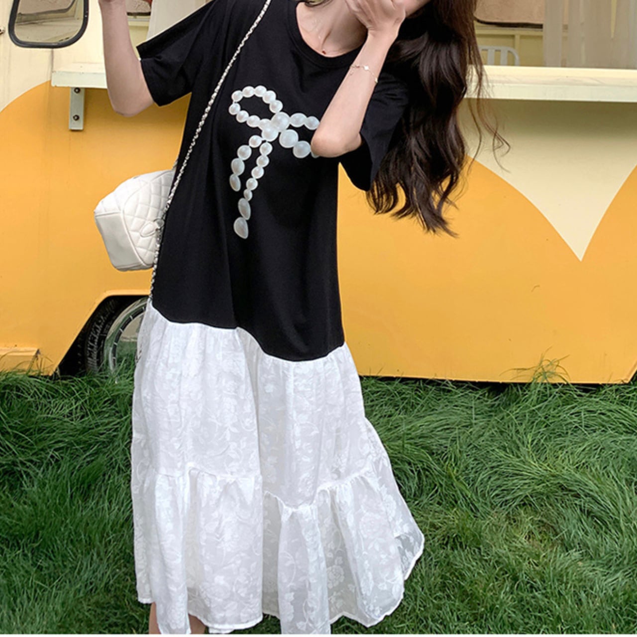 # パール リボン Tシャツ フラワー ワンピース ブラック×ホワイト 250491