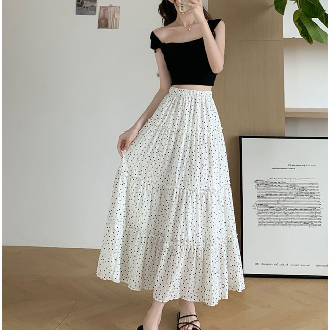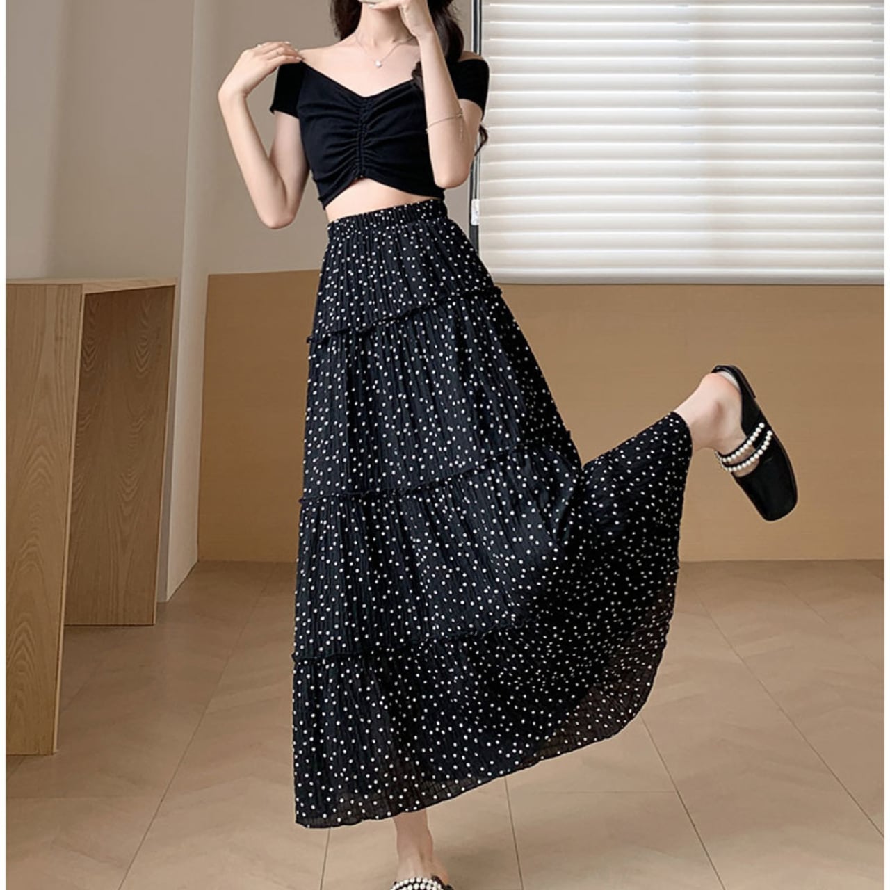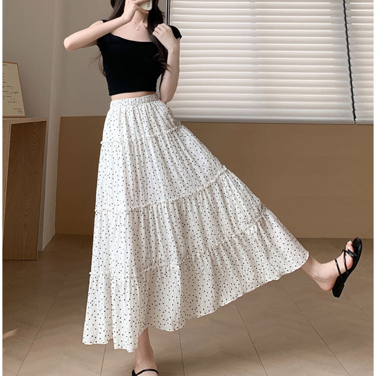 ドット柄がかわいらしいAラインロングスカートで、シンプルさの中にも独自の魅力を感じさせます!