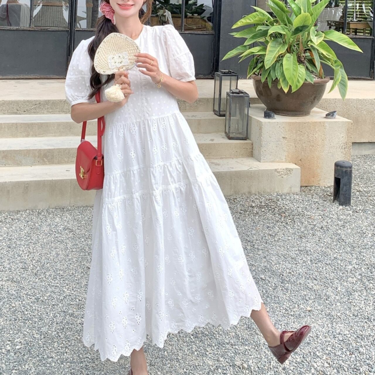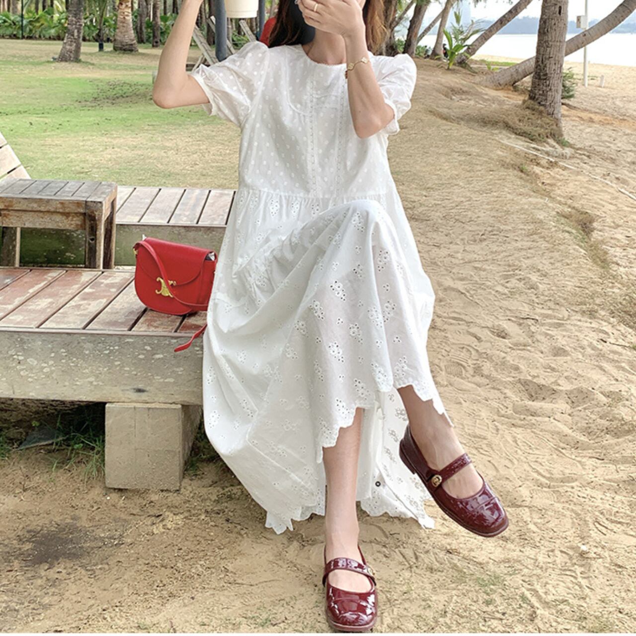 レース 刺繡 Aライン ワンピース パフスリーブ ホワイト 250498