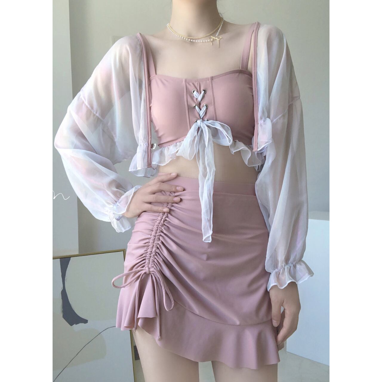 # 水着 リボン フリル ツーピース パーカー セット ピンク 250506