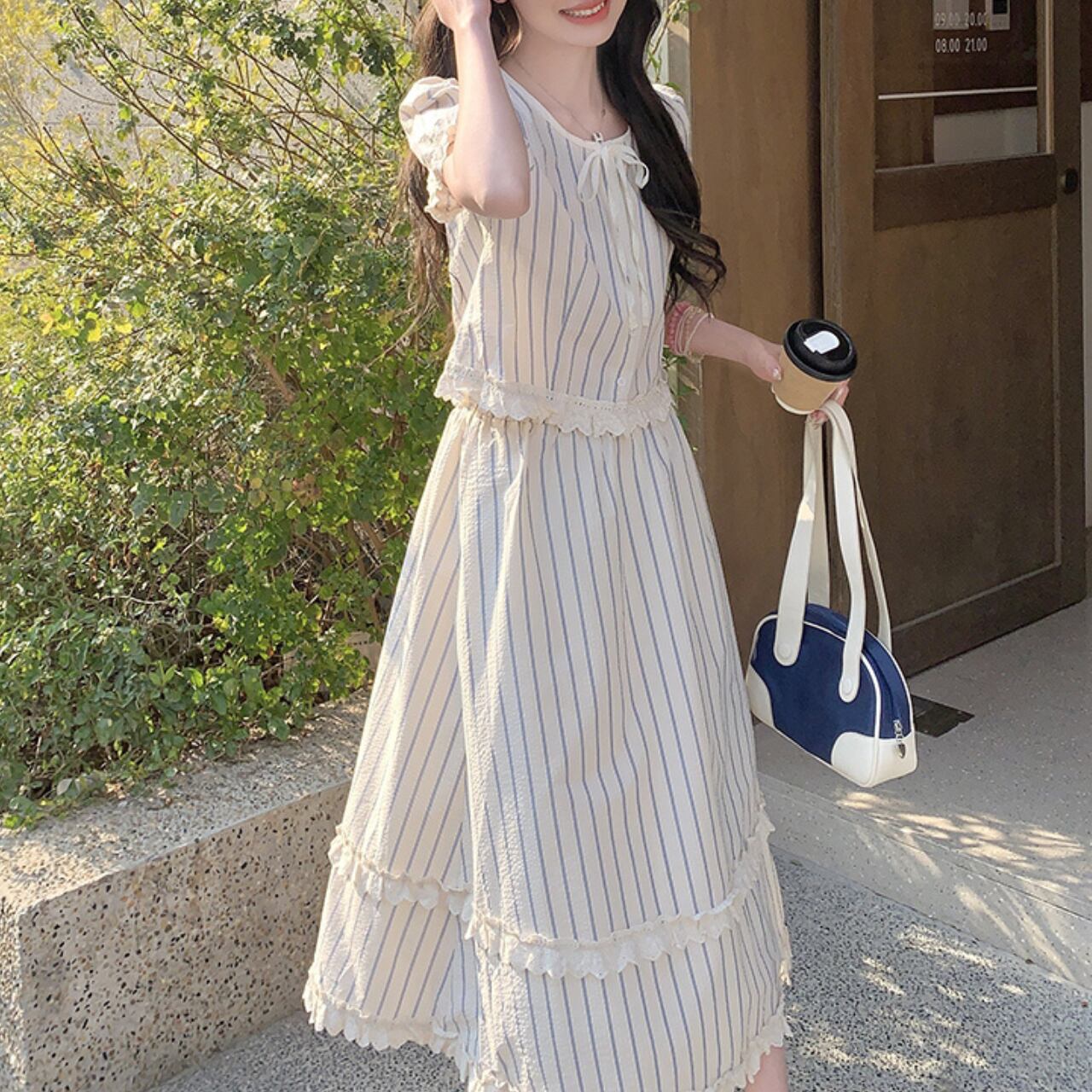 レース ブルー ストライプ ワンピース ツーピース セット 250507