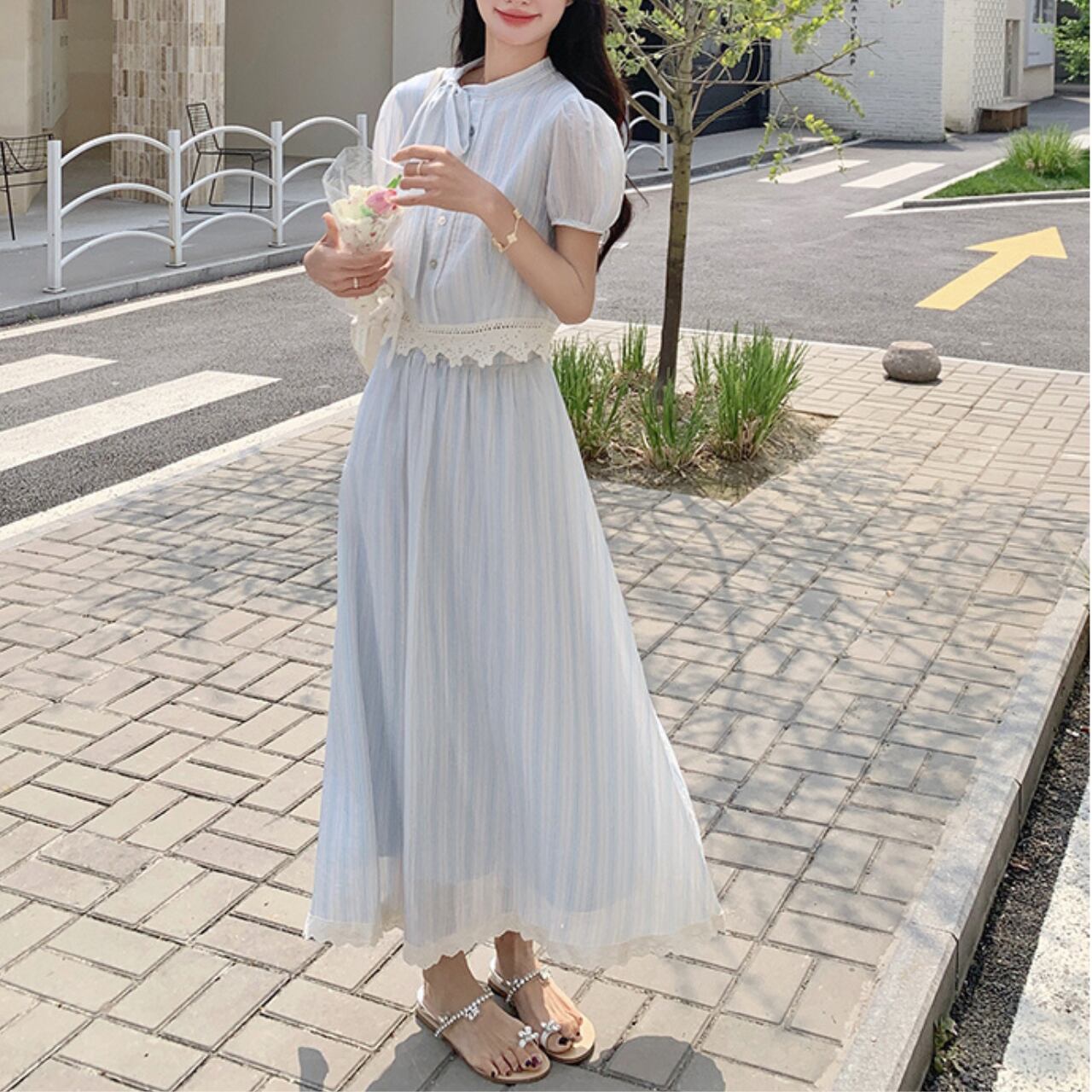 リボン レース パフスリーブ ストライプ ブルー ワンピース ツーピース 250509