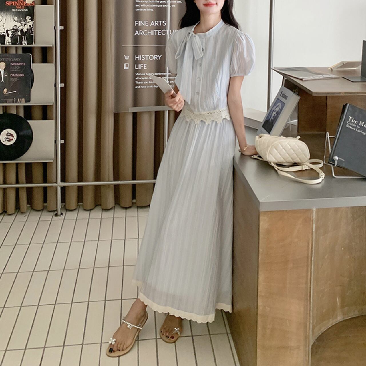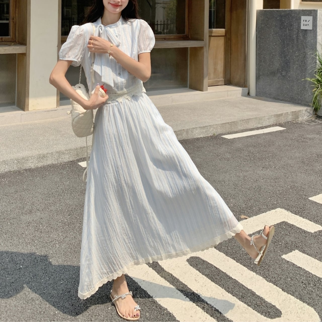 # リボン レース パフスリーブ ストライプ ブルー ワンピース ツーピース 250509