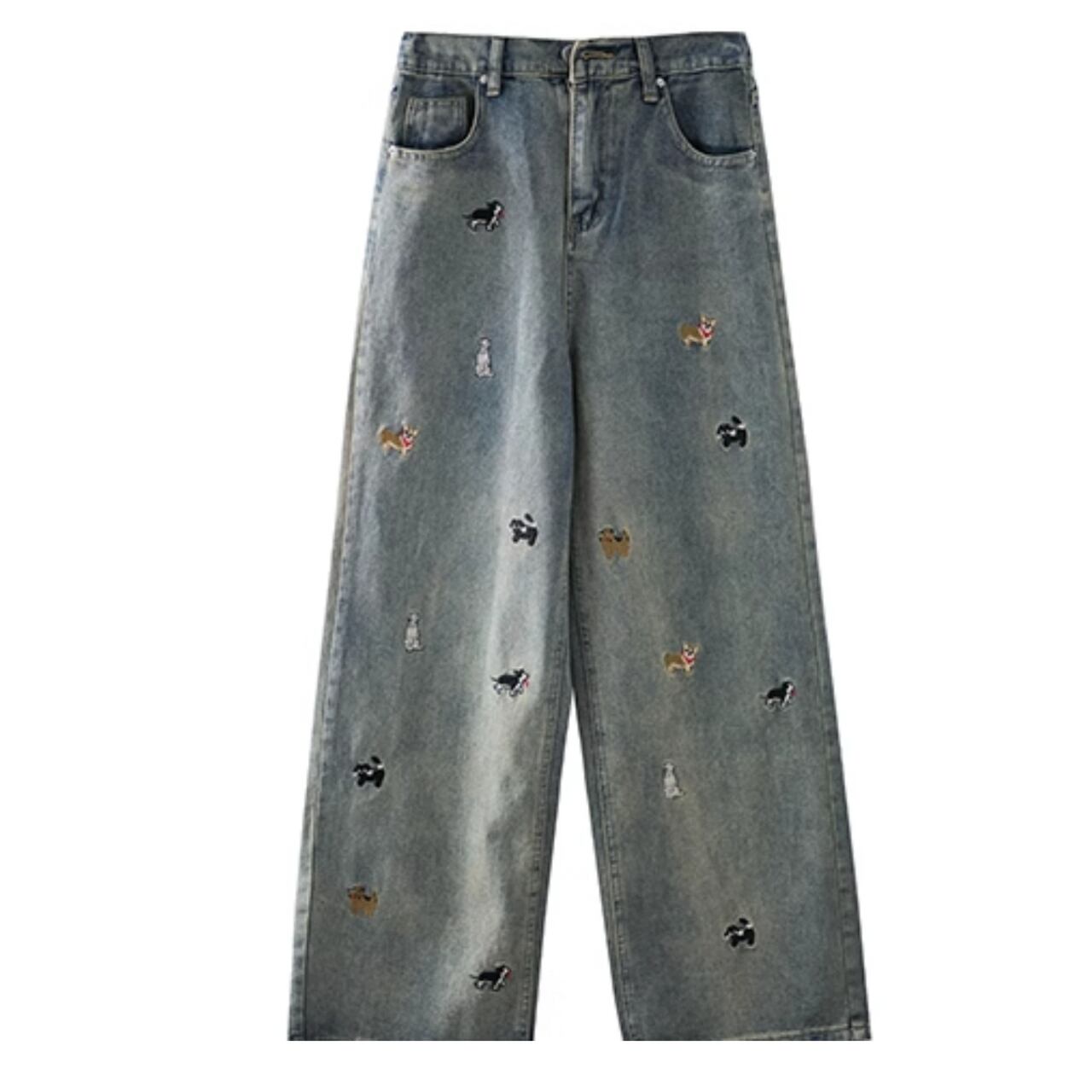 # ドッグ 刺繡 デニム ストレート ワイド パンツ 250510