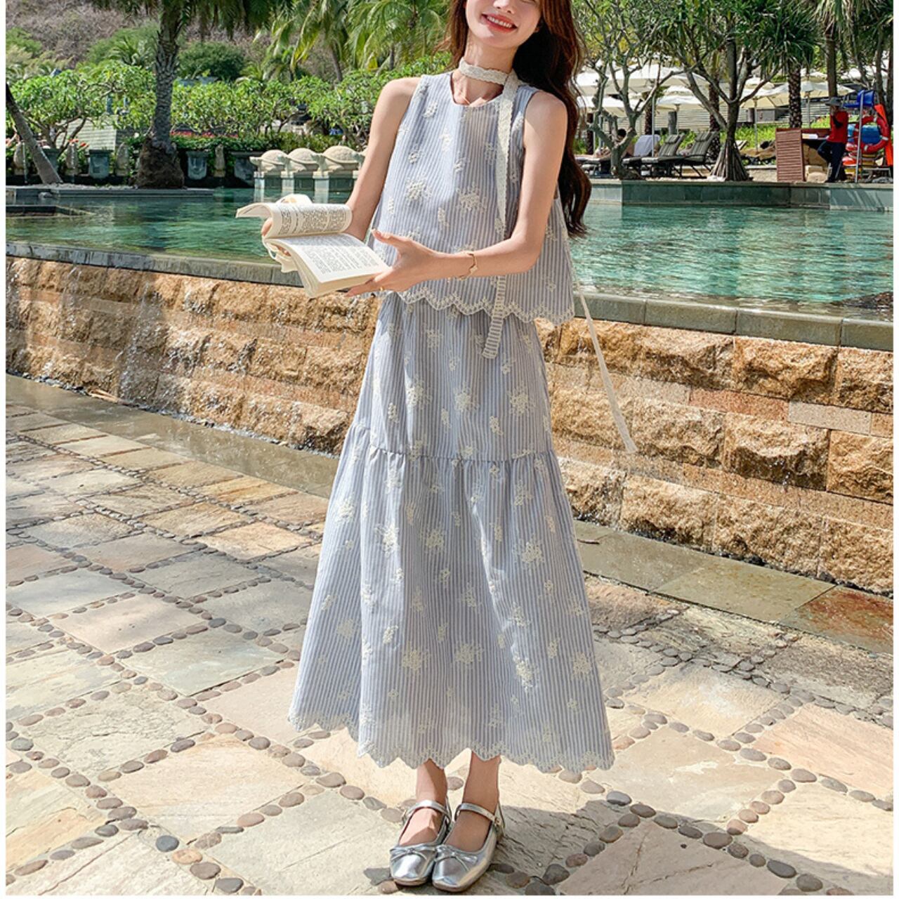 # フラワー 刺繡 レース ノースリーブ ブルー ストライプ ワンピース ツーピース 250511