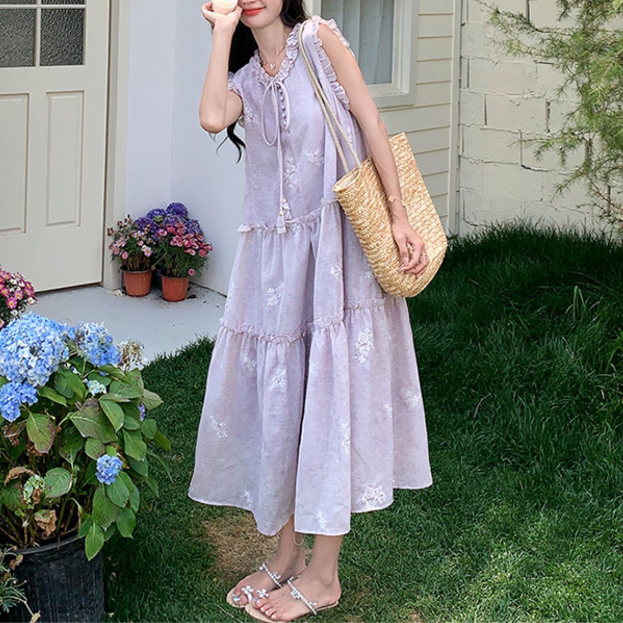 涼しげなラベンダーカラーと、ふんわり広がるティアードシルエットが魅力の大人かわいい夏ワンピース。
