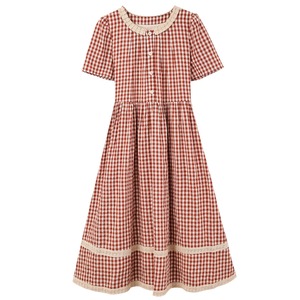 # ギンガムチェック レース 半袖 ワンピース レッド 250513