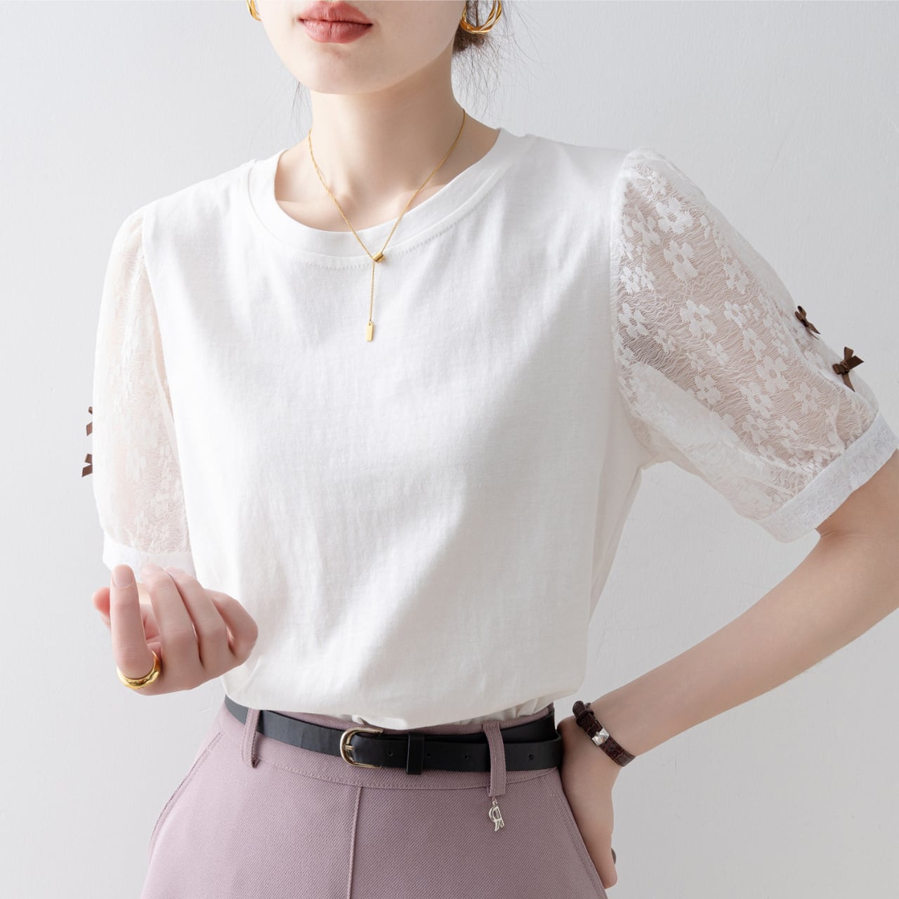 エレガントなレース袖とリボンディテールが特徴の半袖カットソー。