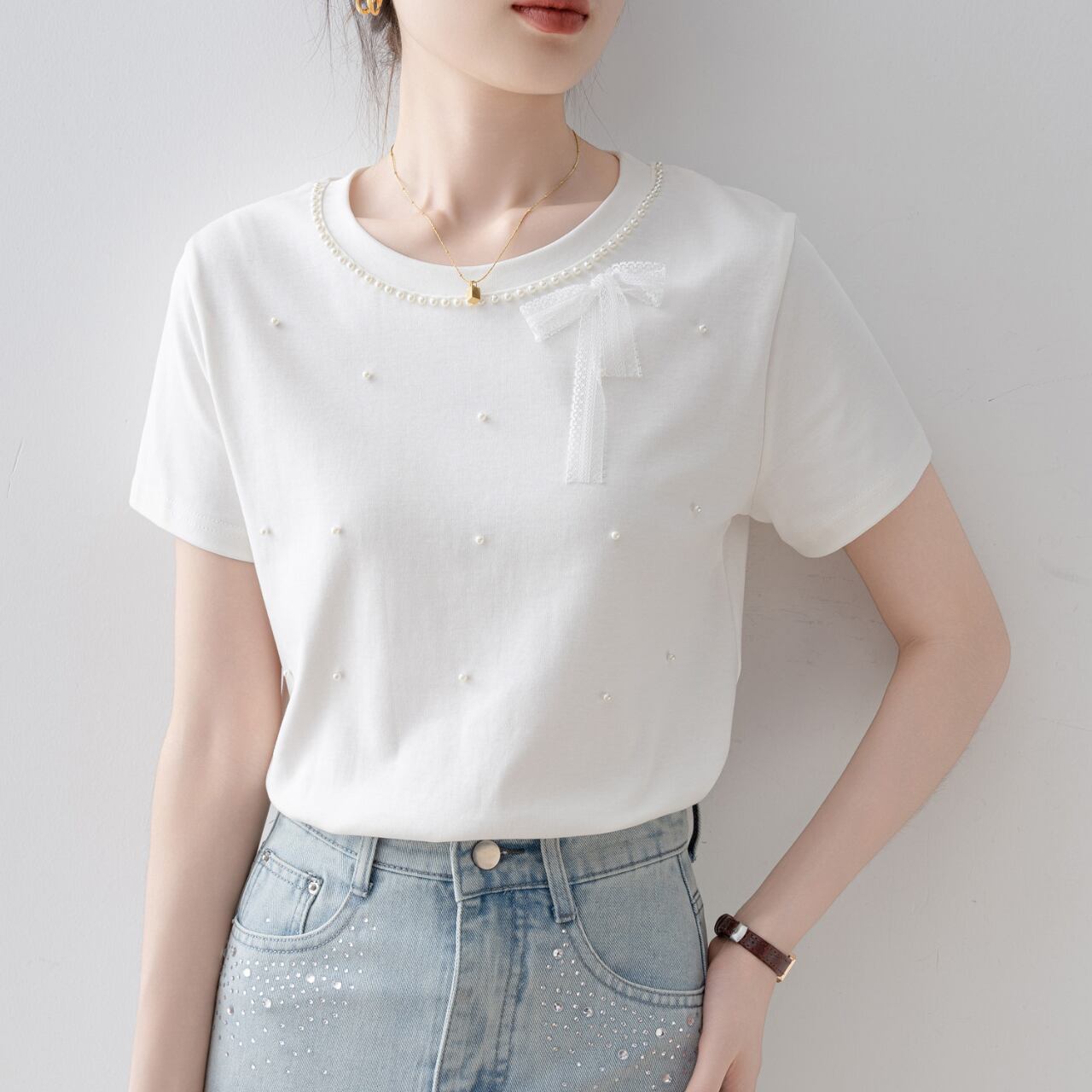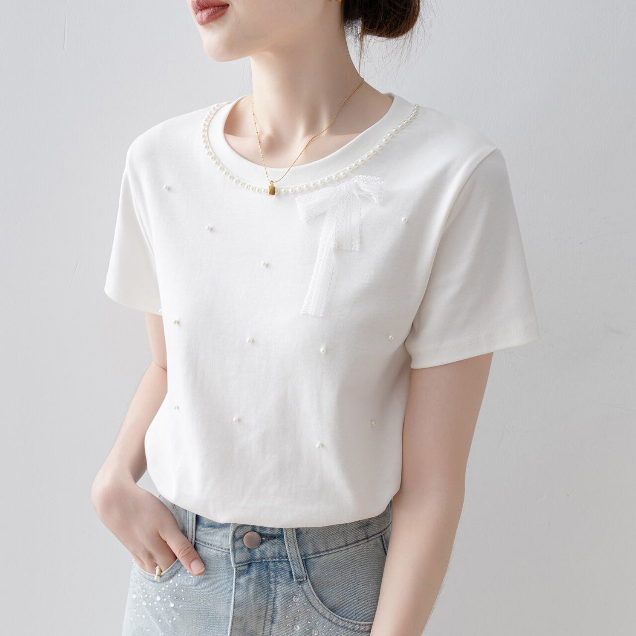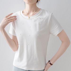 リボンとパールのデザインが華やかさを引き立てる半袖カットソー。