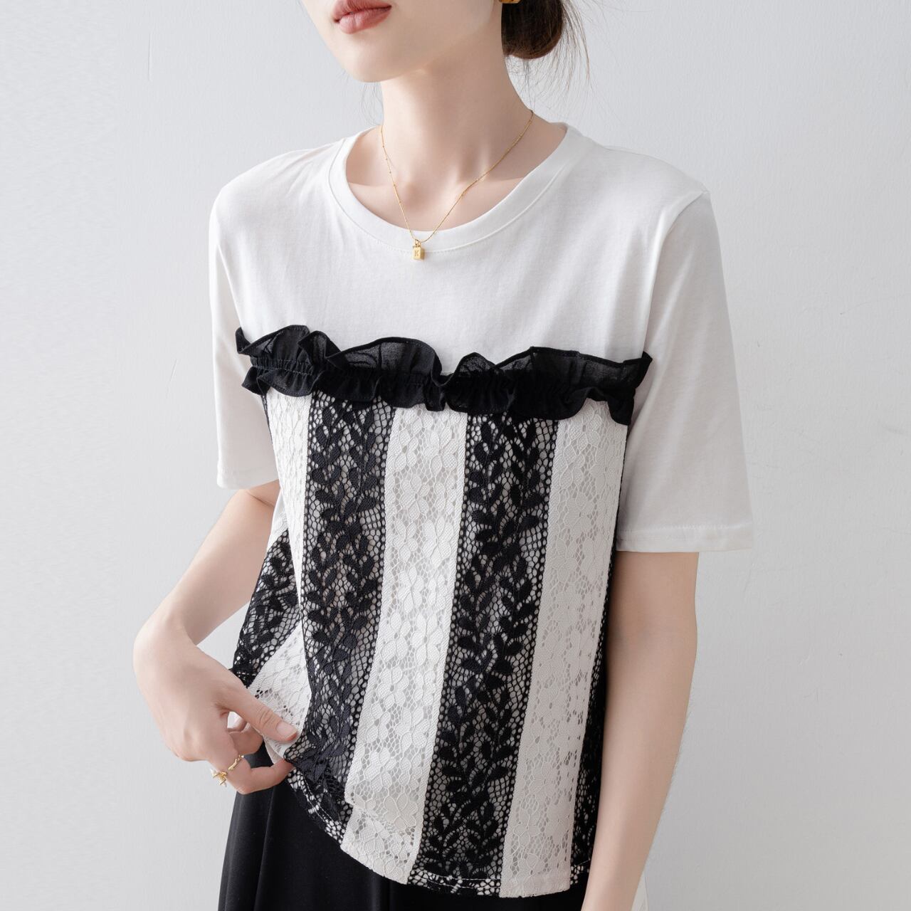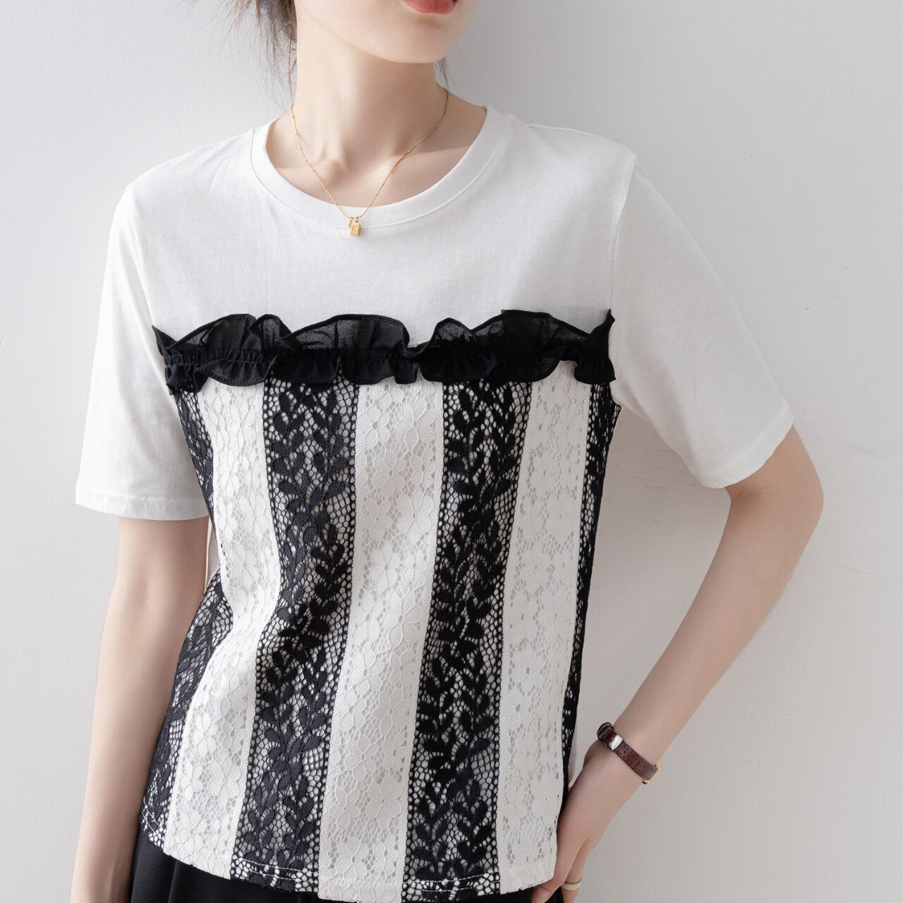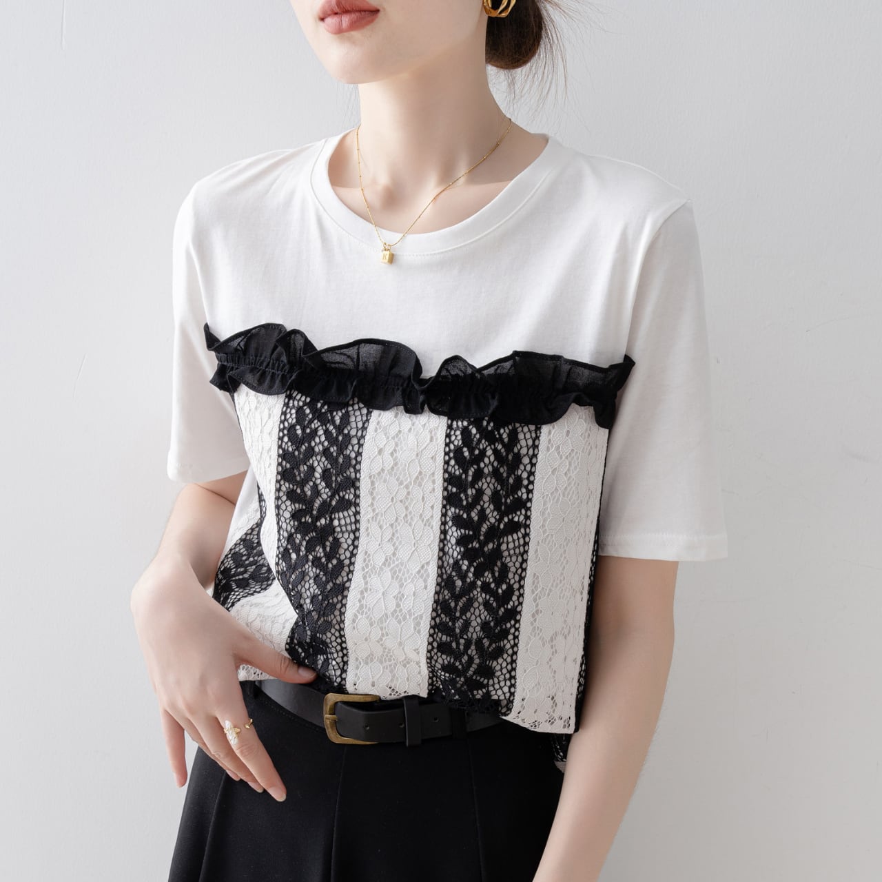 レースディテールが魅力的なホワイト×ブラックの半袖Tシャツ。