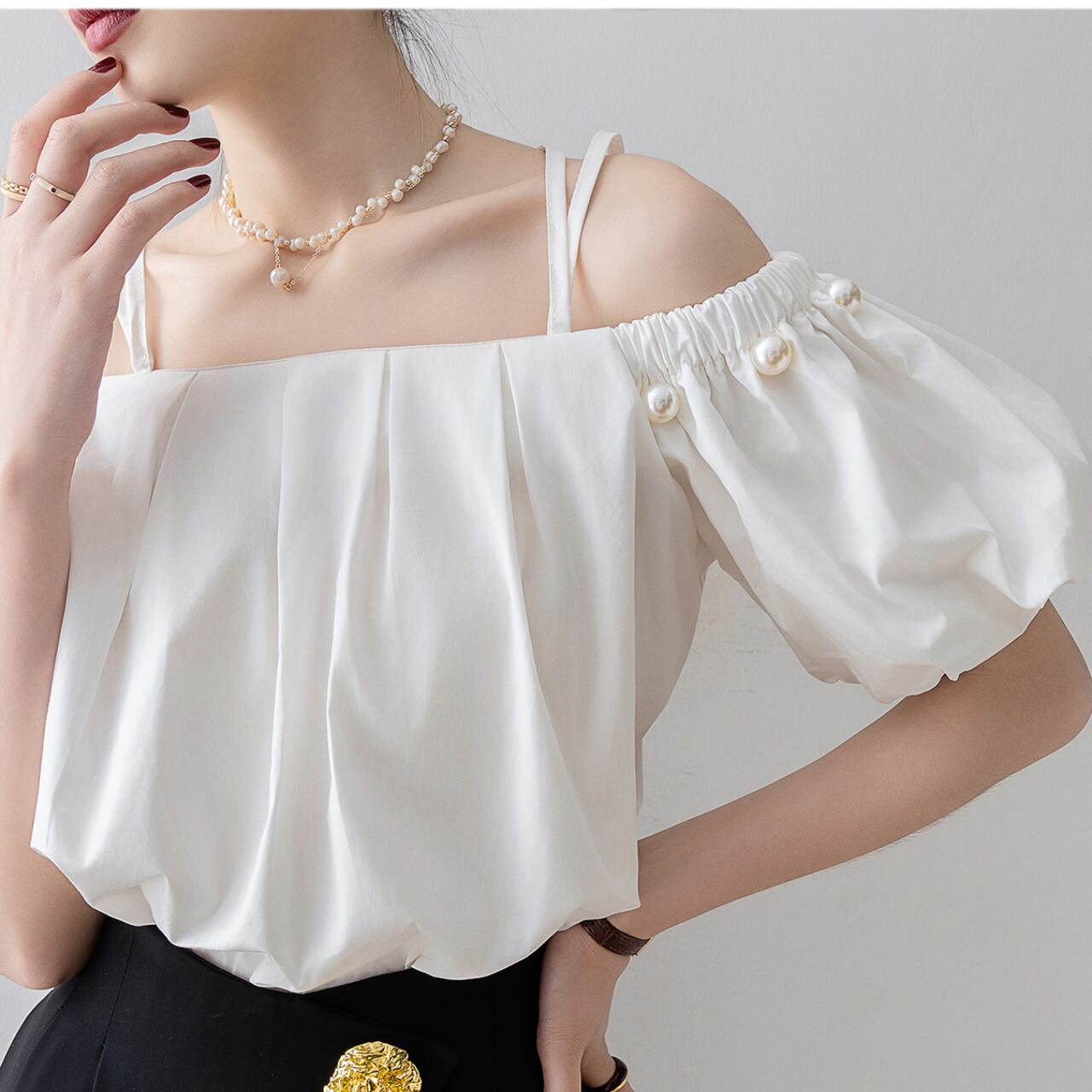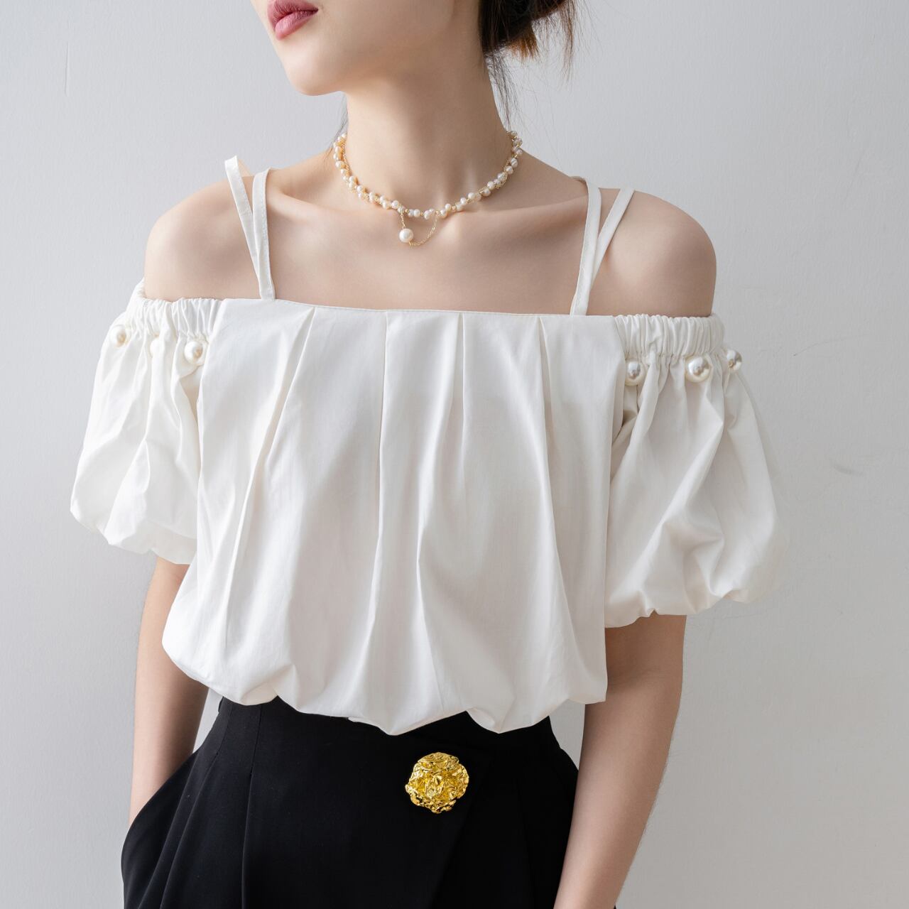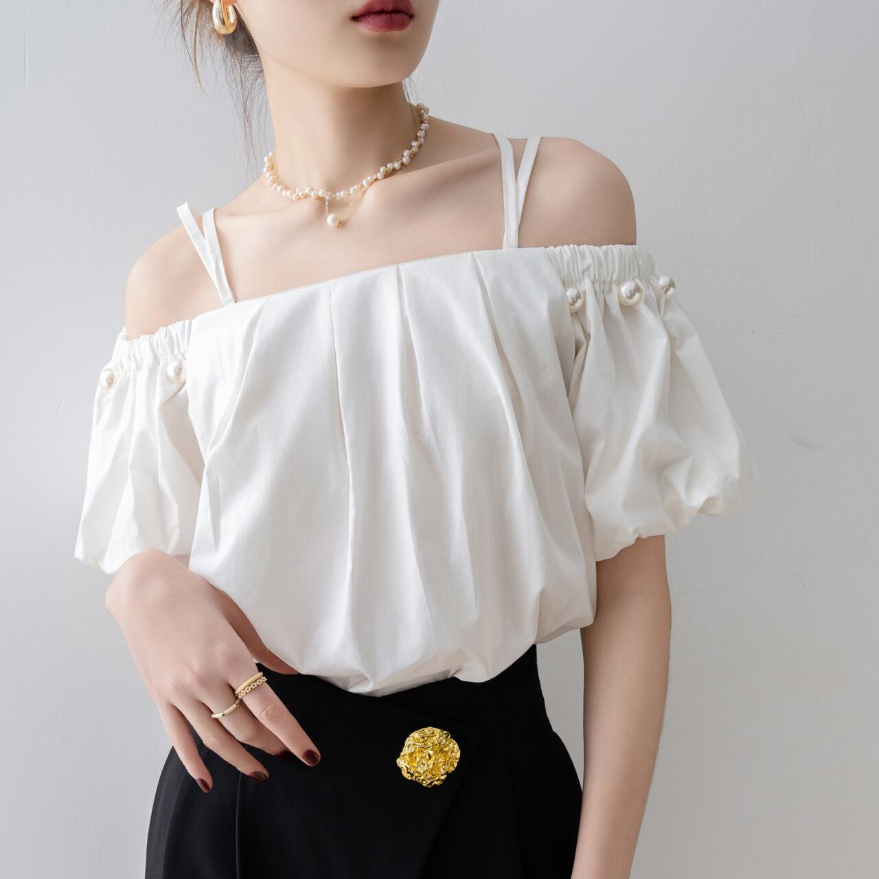 肩を美しく見せるオフショルダーデザインが女性らしさを引き立て、パールのアクセントが全体のコーディネートに華やかさをプラスします。