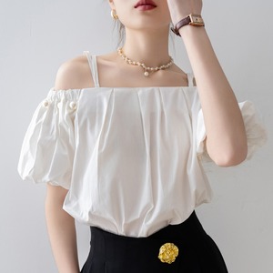 オフショルダーとパールのディテールが魅力的なホワイトの半袖カットソー。