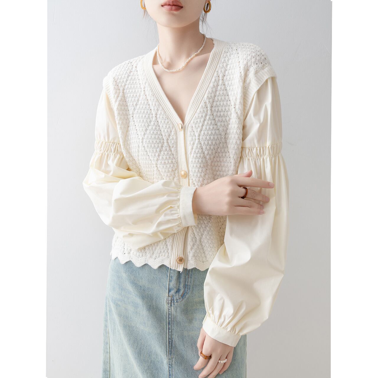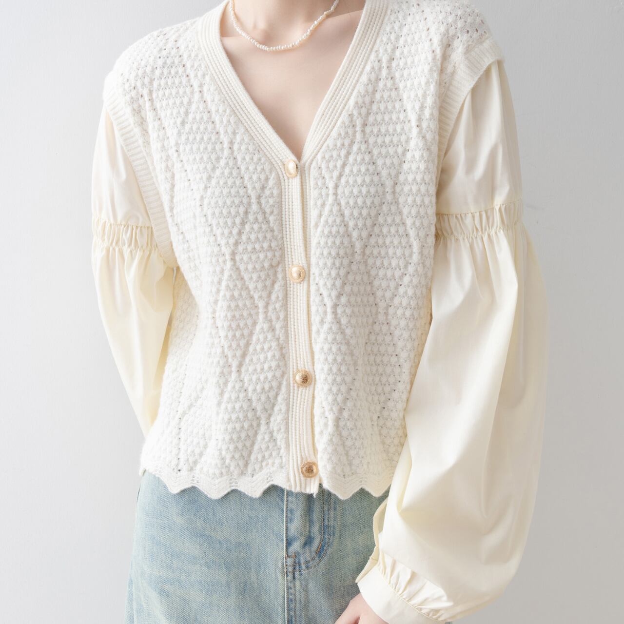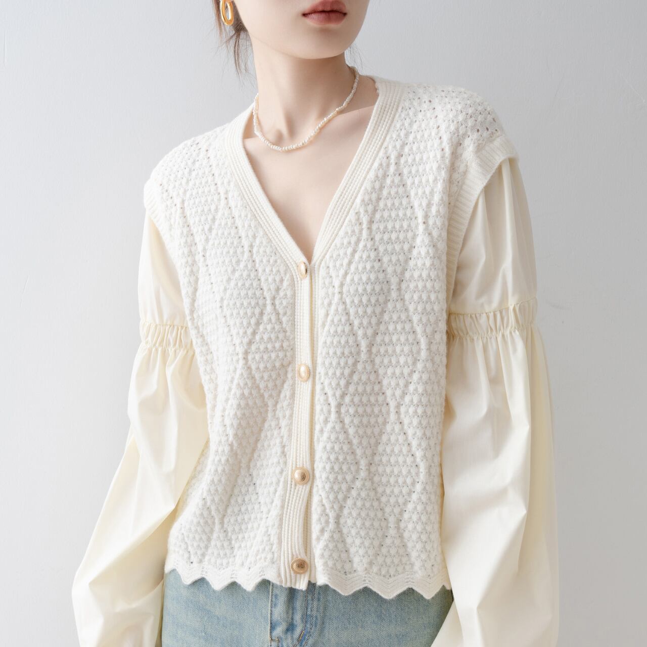 # ニット Vネック 異素材 カーディガン フェイクツーピース ランタンスリーブ オフホワイト 250526