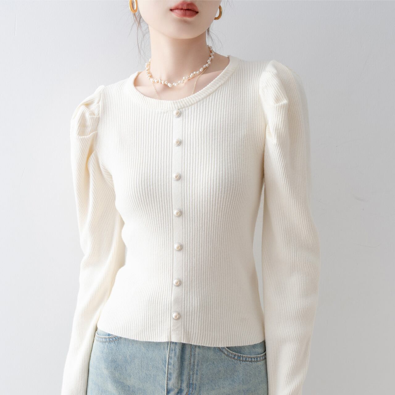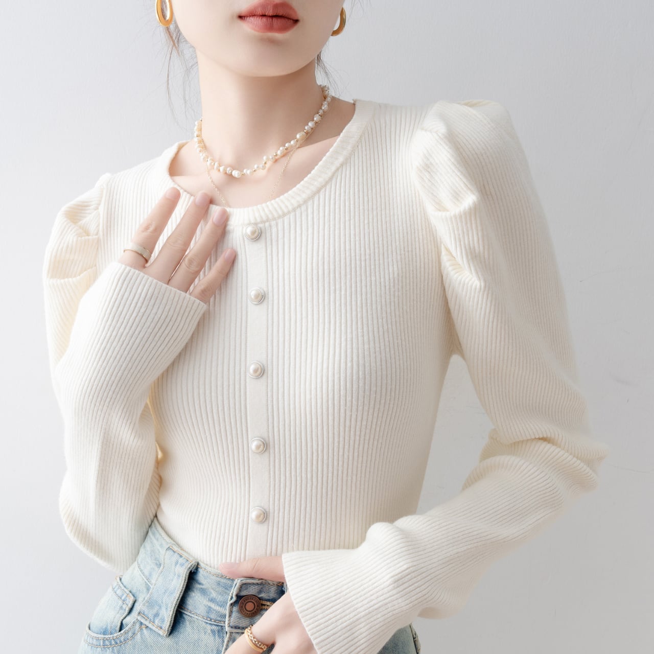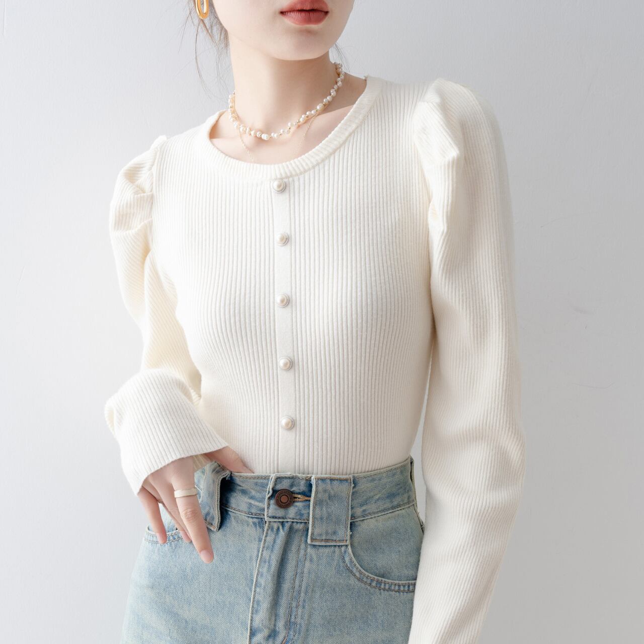 パールボタンが上品さを引き立てるホワイトのパフスリーブカーディガン。