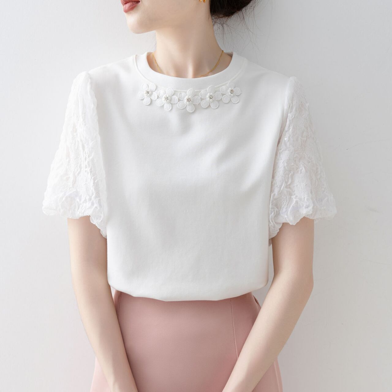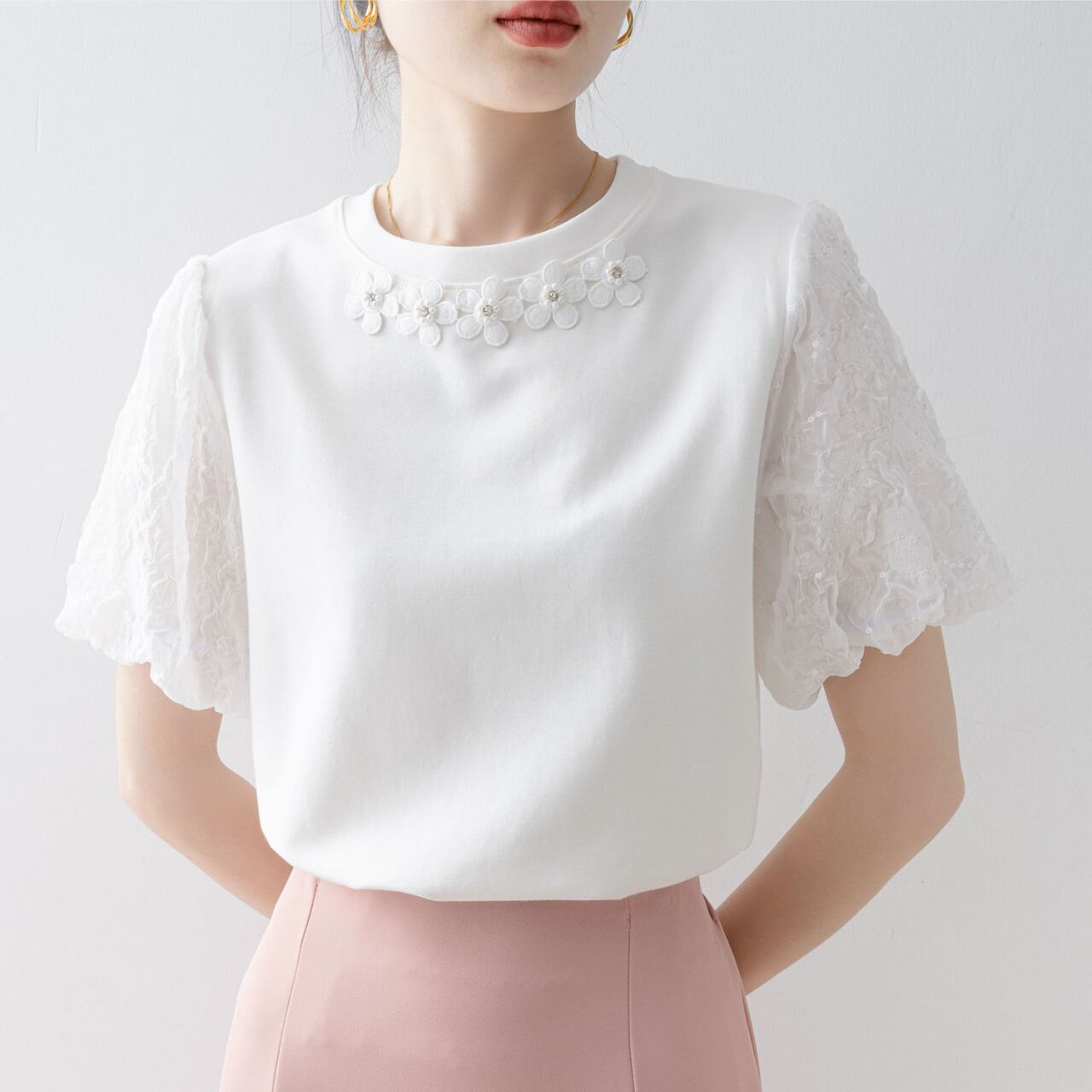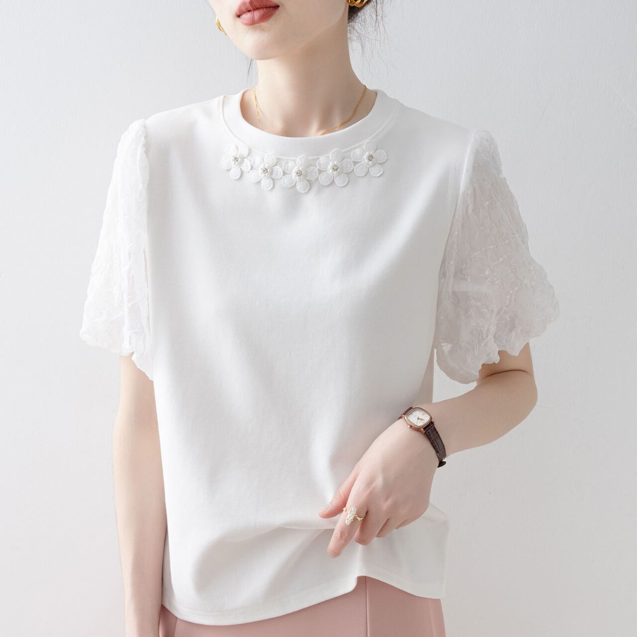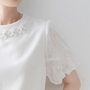 華やかなフラワーとレース袖が印象的なホワイトの半袖カットソー。