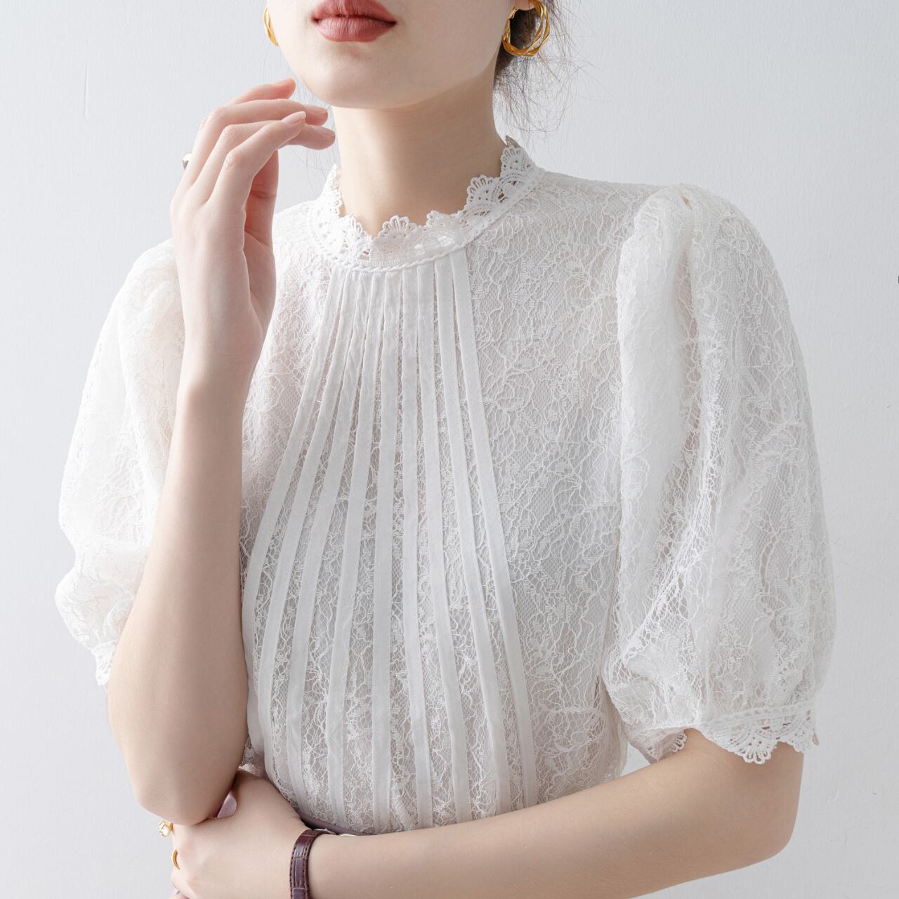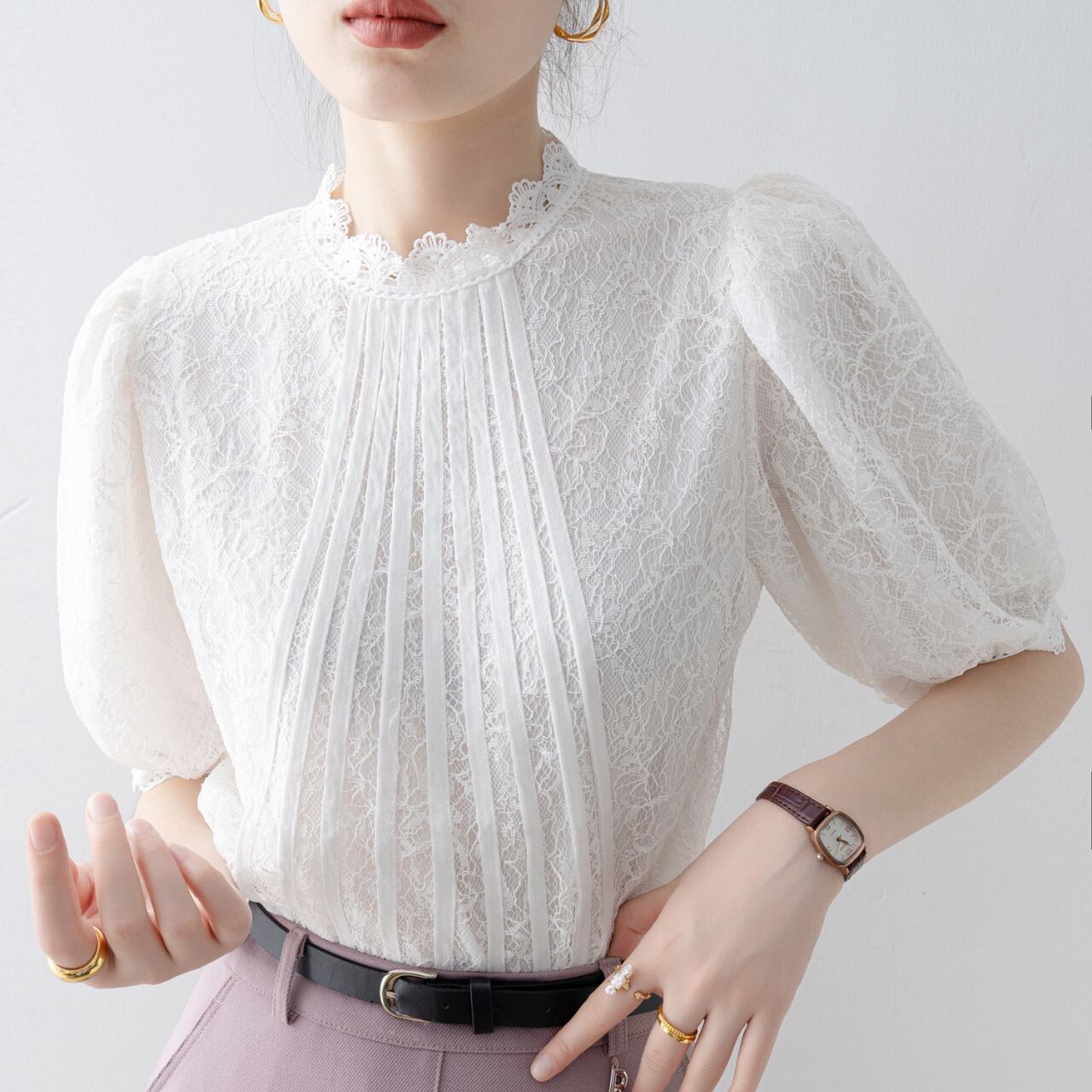 優雅なレースと軽やかなランタンスリーブが特徴のホワイトブラウス。