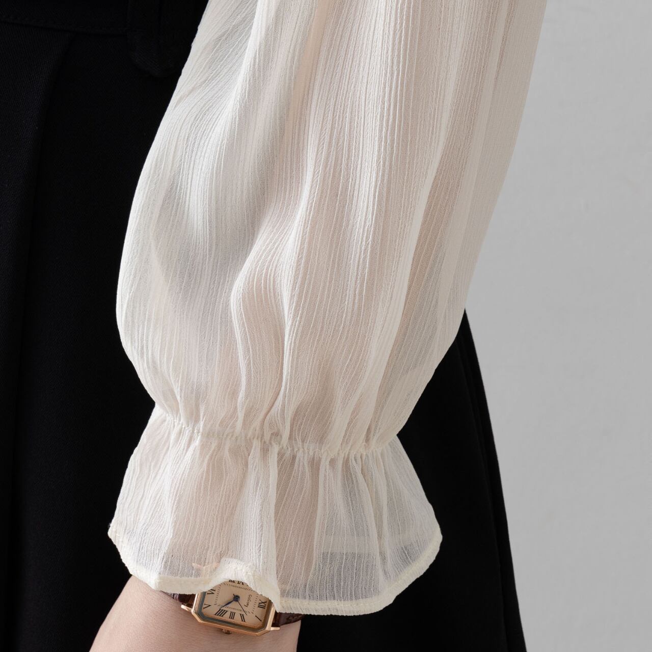 ベルスリーブの流れるようなラインが、動くたびに女性らしさを引き立て、洗練された印象を与えます。