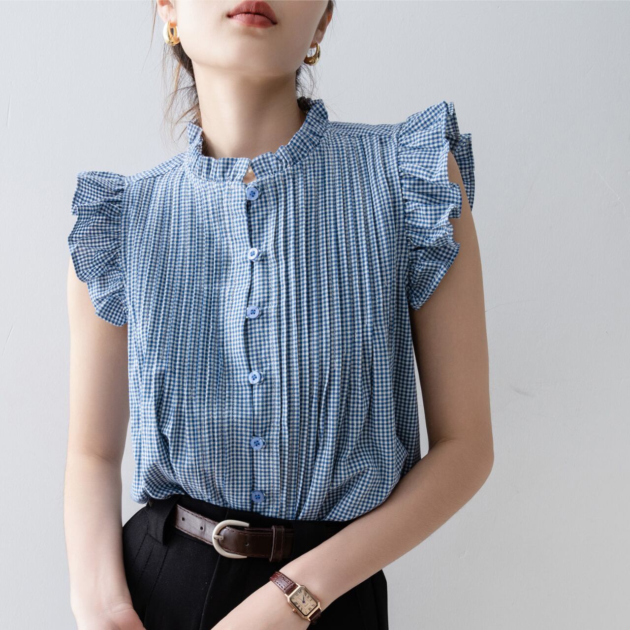 ギンガムチェック フリル ハイネック ノースリーブ ブラウス ブルー 250551
