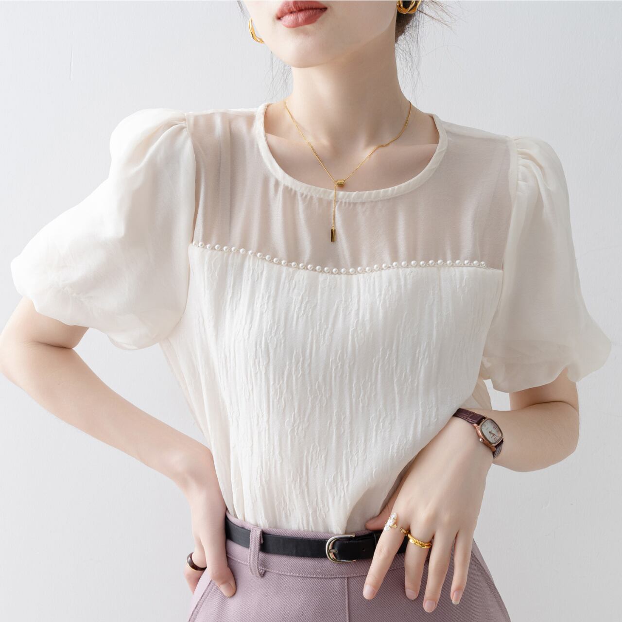 軽やかなシフォン素材が、肌触りよく快適さを提供し、これからの季節にぴったりのアイテムです。