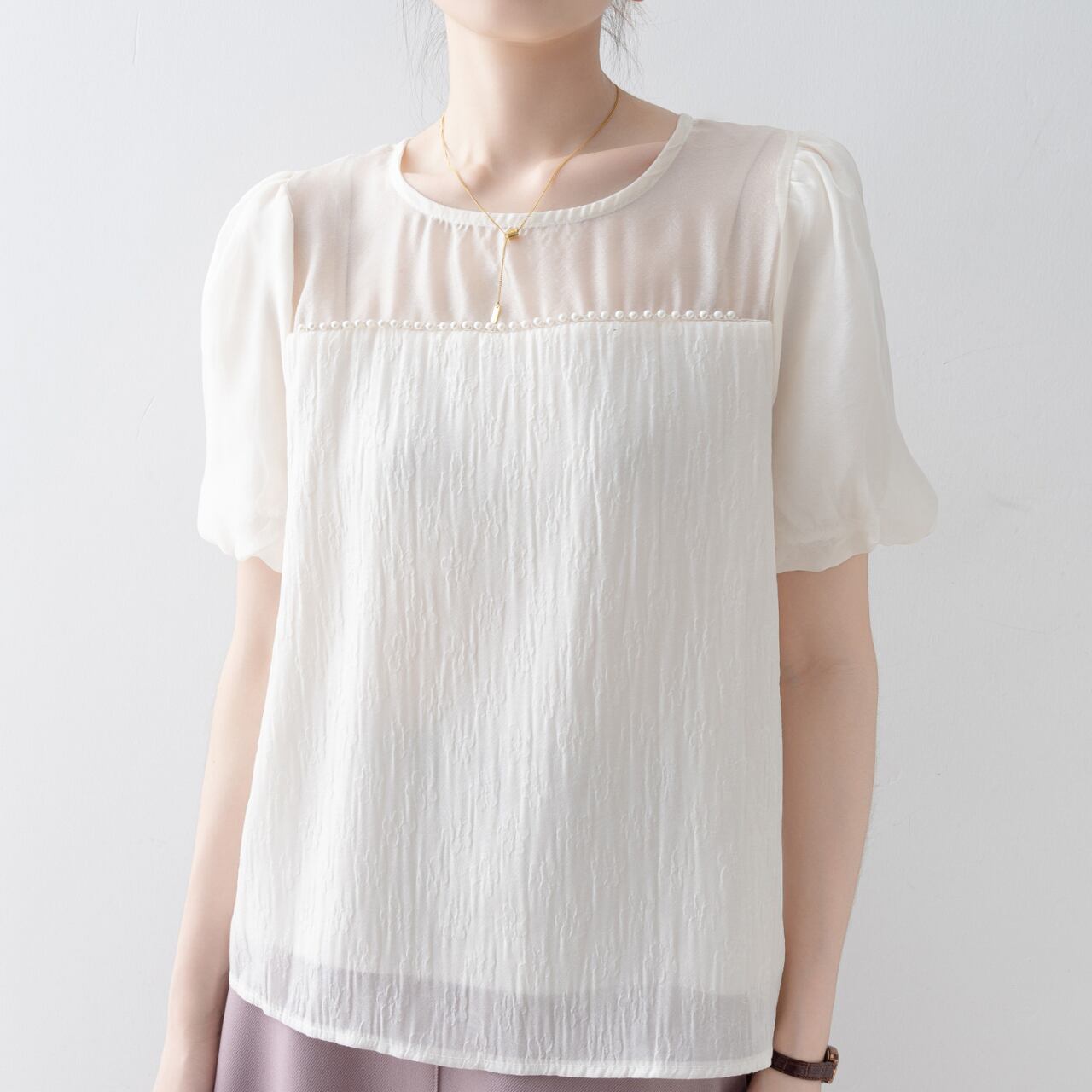 エレガントなパールが魅力の半袖カットソー。