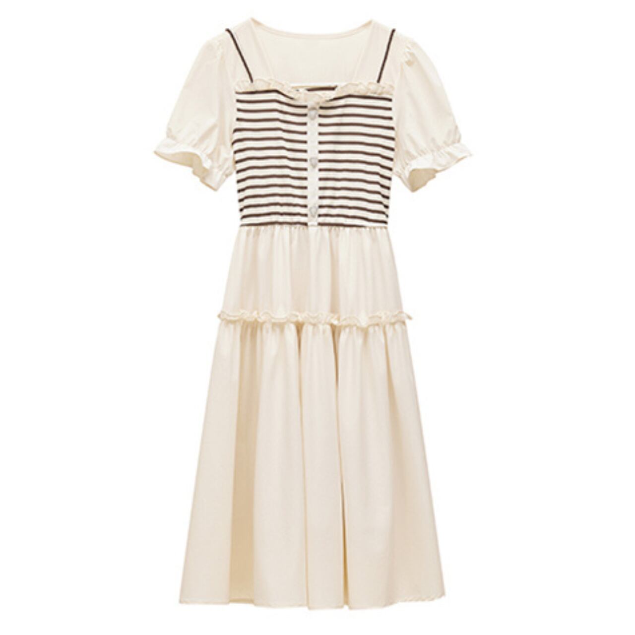 # ハートボタン ボーダー スクエアネック パフスリーブ ワンピース ブラック 250564